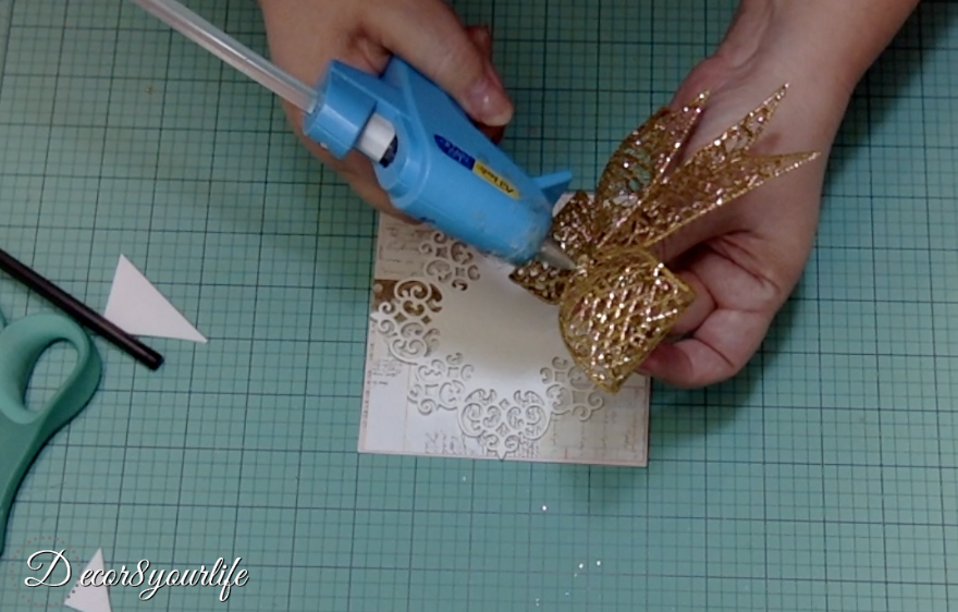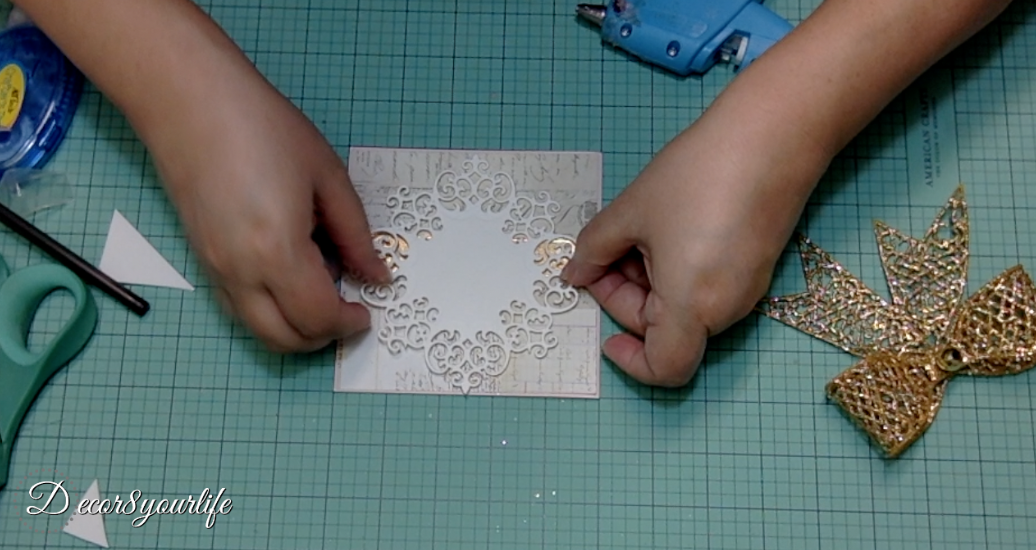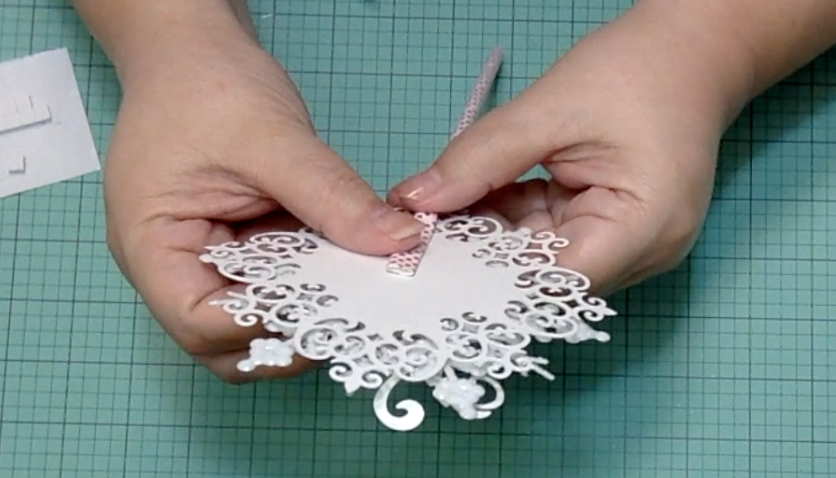 You can then use foam dots or a foam backing to add dimension to a decorative die-cut frame.  A die-cut frame will look beautiful behind your bow.