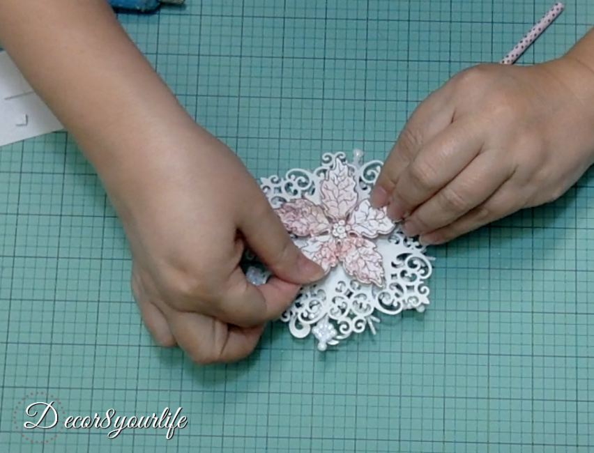 Then with some decorative die-cuts, we layer our snowflake.  We use a hot-glue gun and some foam dots for dimension.