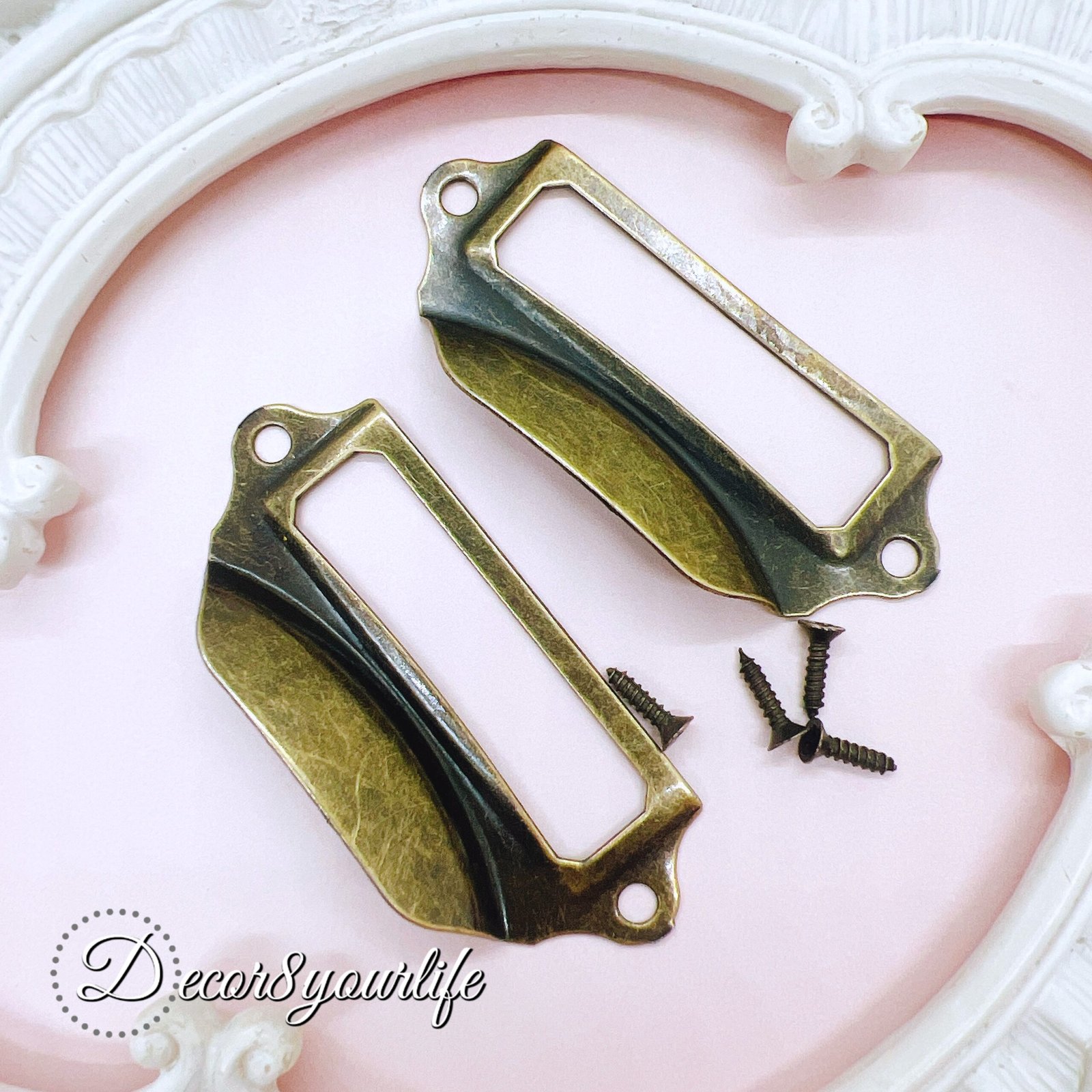 Old library vibes for your craft room 📚✨  These antique bronze label pulls come as a set of two (screws included) and they’re perfect for turning any plain little drawer or box into a “mini card catalog.” Each pull has a spot for a tiny paper label, so you can organize charms, lace, ephemera, beads — and it actually looks pretty sitting on your desk.  They’re about 2.75″ x 1.25″ each, and once they’re gone, they’re gone.