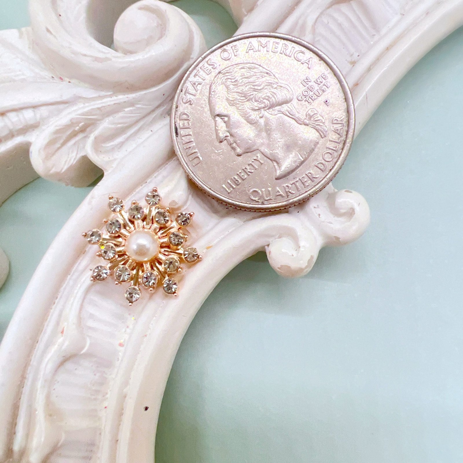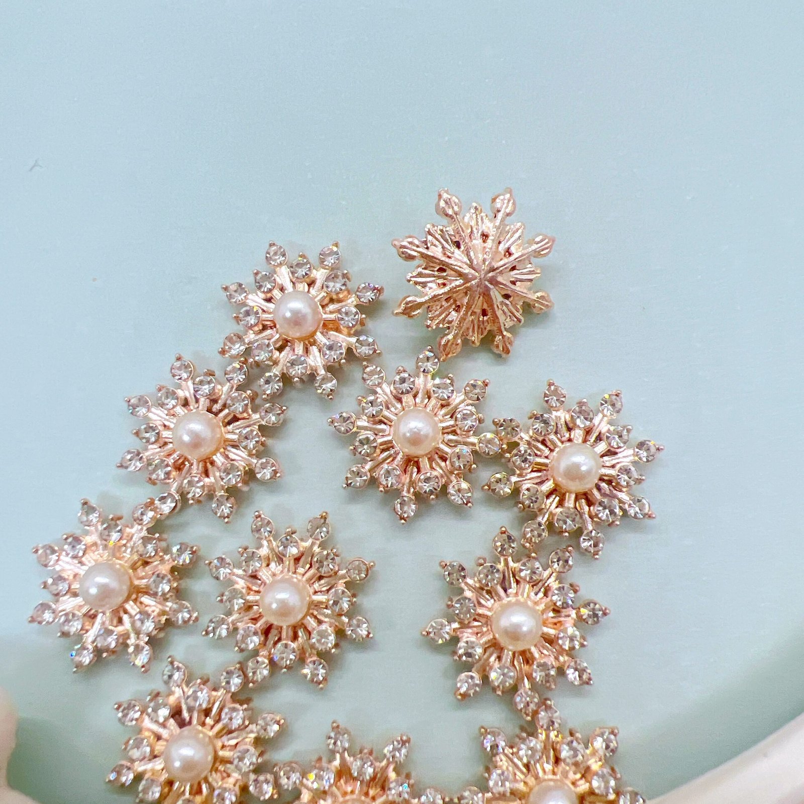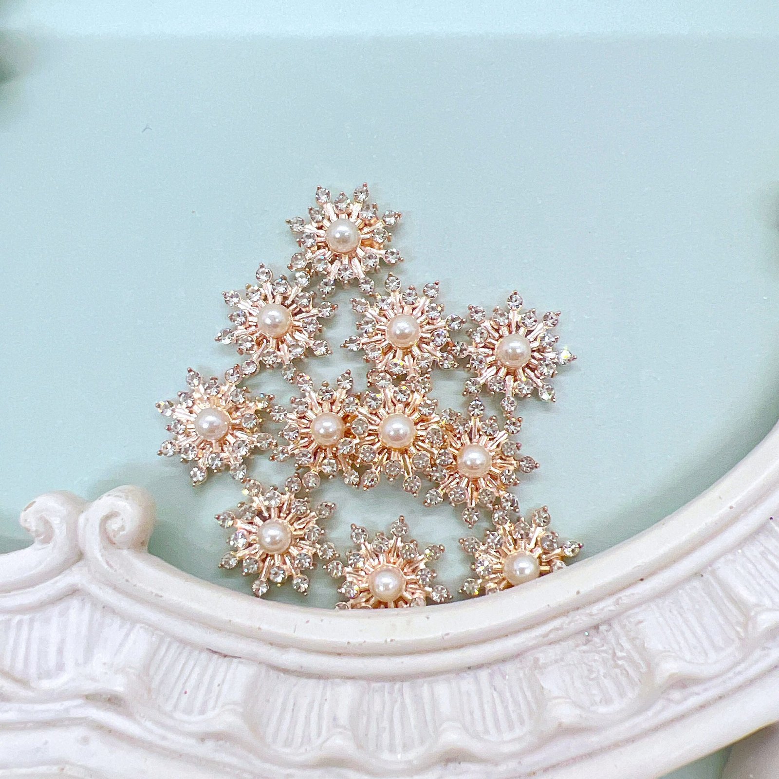 Add a touch of sparkle and elegance to your handmade projects with these gold alloy snowflake flat back cabochon embellishments. Each snowflake features delicate rhinestone accents with a faux pearl and is designed to bring dimension and light to your craft makes without overpowering your design.