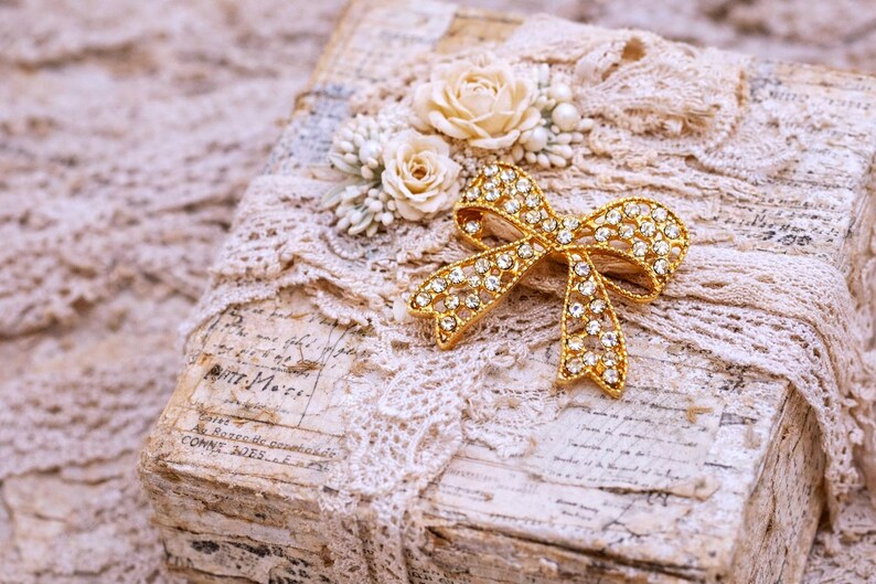 The warm gold finish pairs beautifully with lace, pearls, satin ribbon, florals, and soft neutral palettes, making it ideal for shabby chic, French vintage, Victorian, and romantic themed creations. Whether you are designing a wedding project, a keepsake album, or a decorative gift box, this bow brooch adds a touch of old-world luxury without overpowering your design.