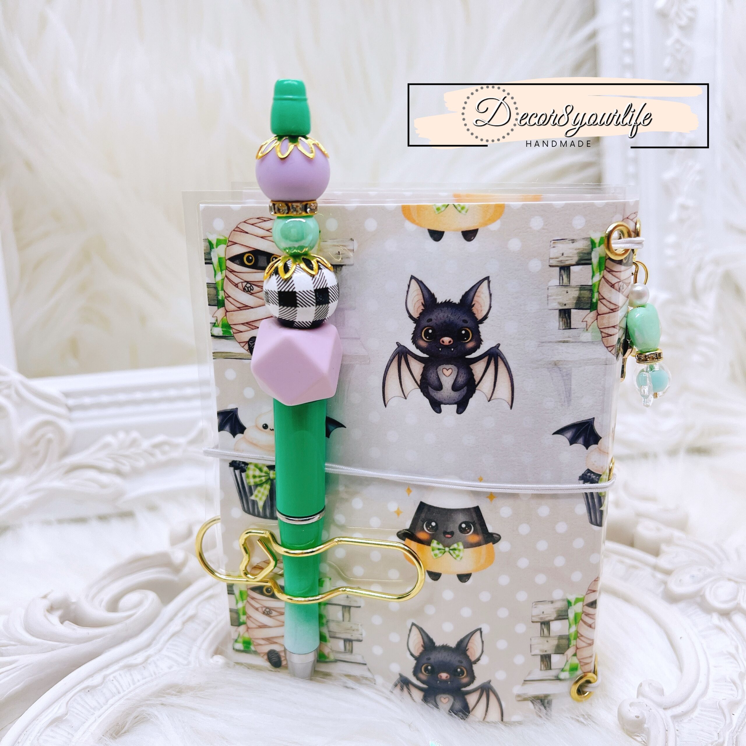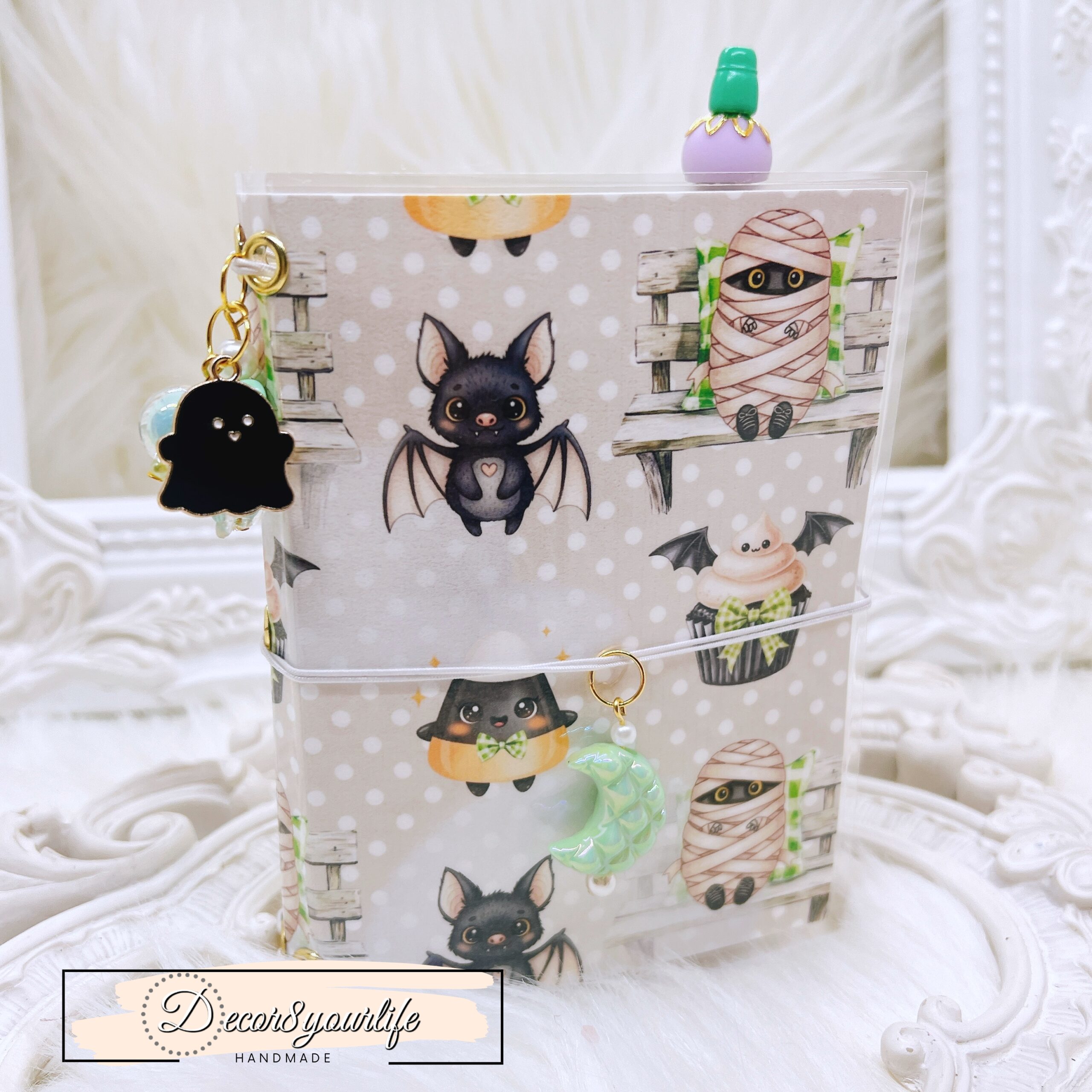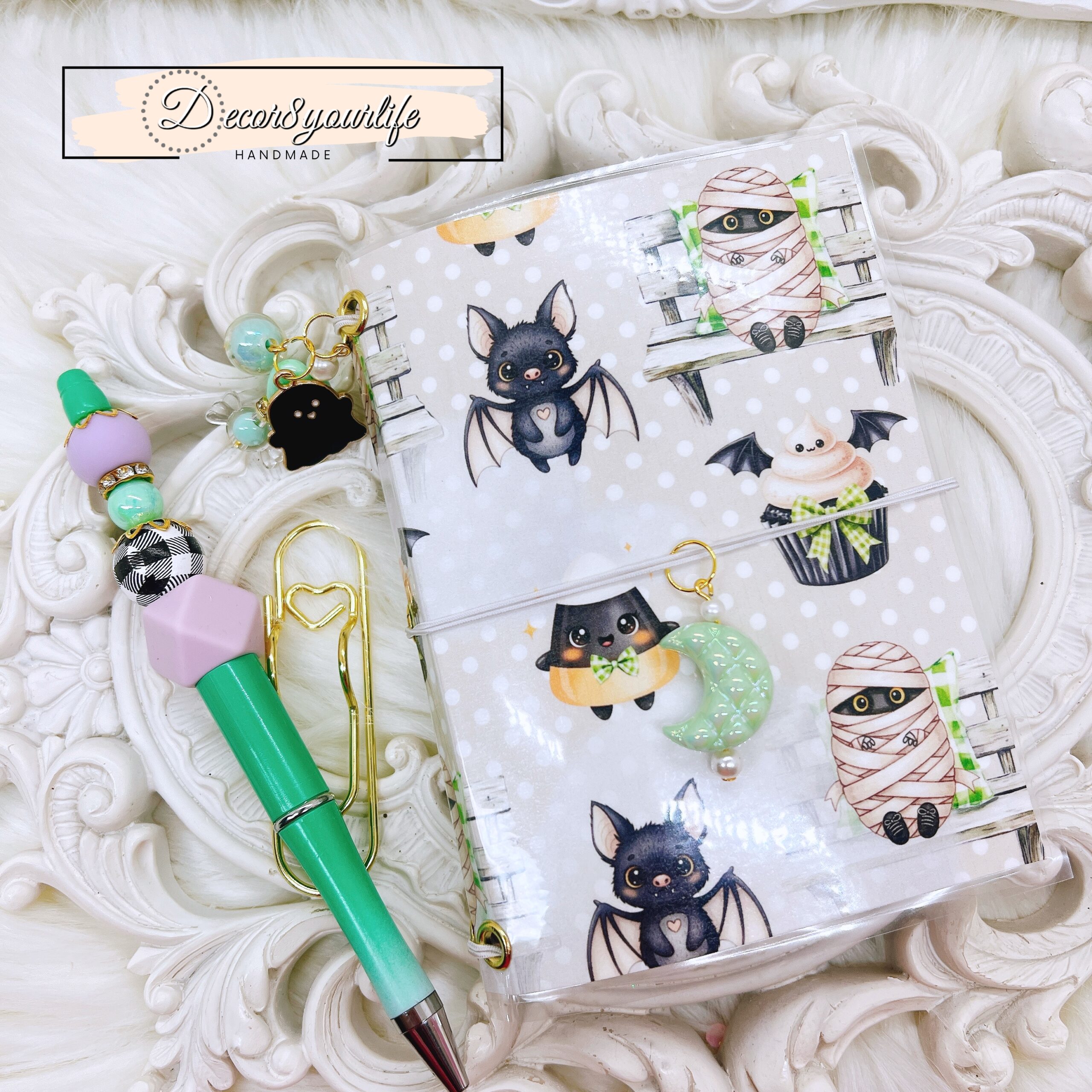Cute Halloween Lolita Goth Theme Laminated Traveler’s Notebook with Matching Beaded Pen