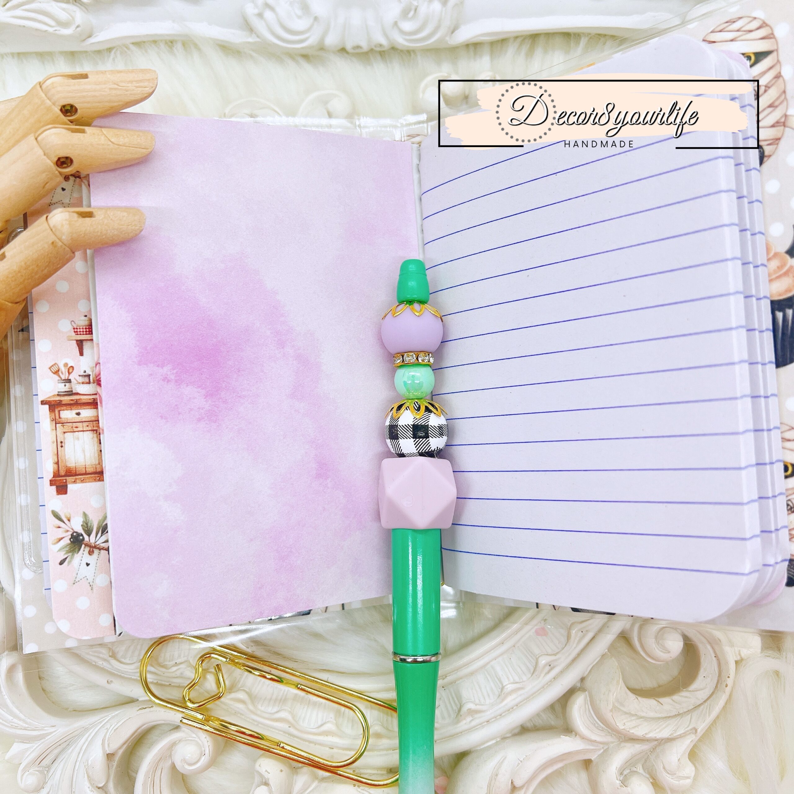 • Handmade Beaded Pen: A stunning pen held in place by a stylish gold-tone paper clip that doubles as a pen holder.