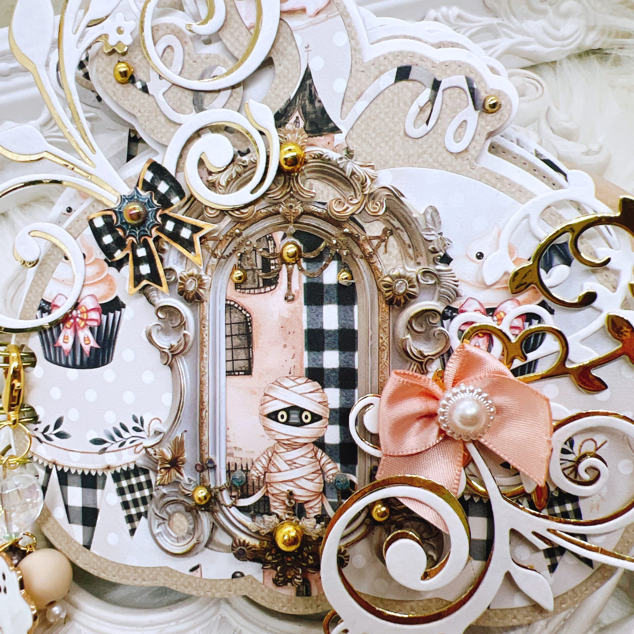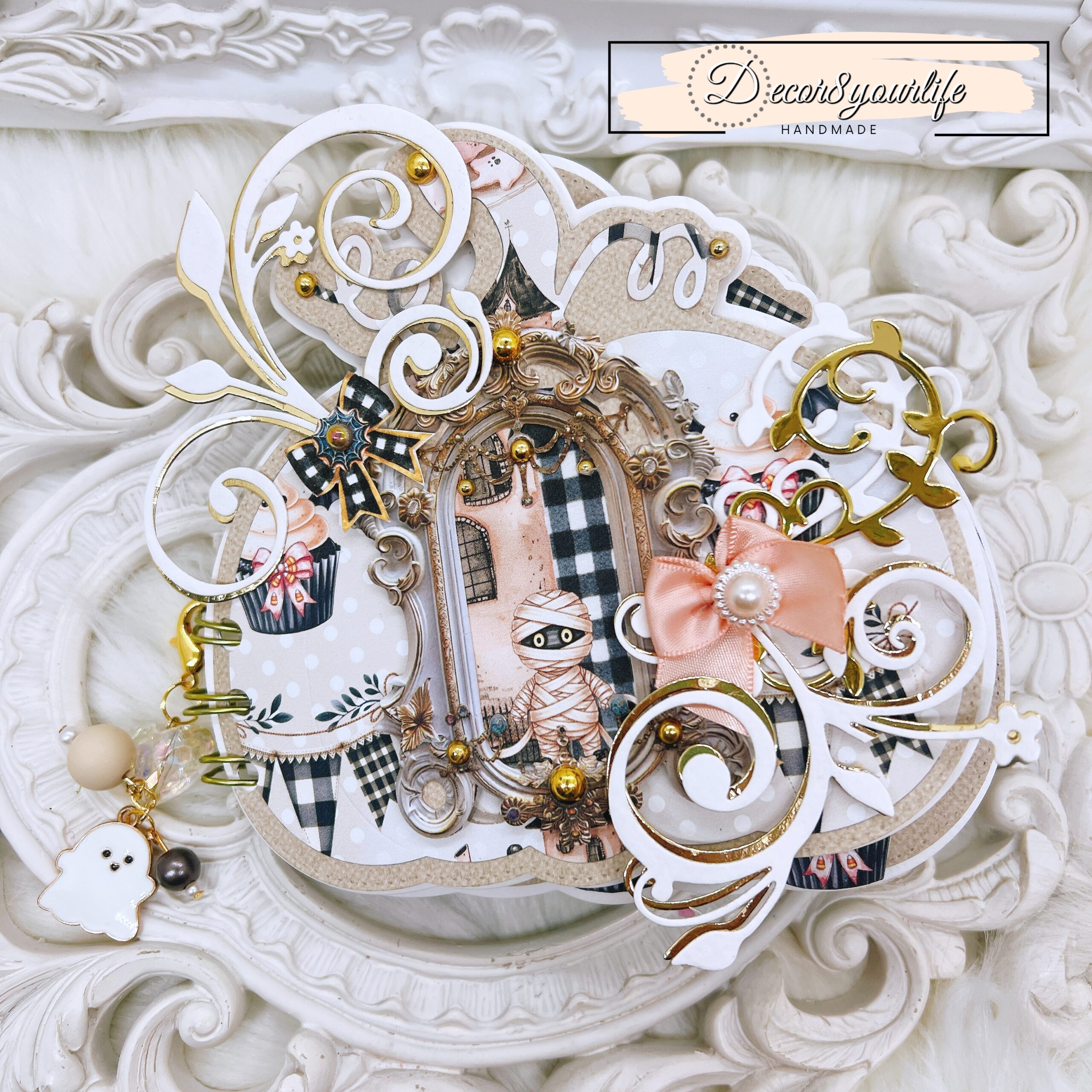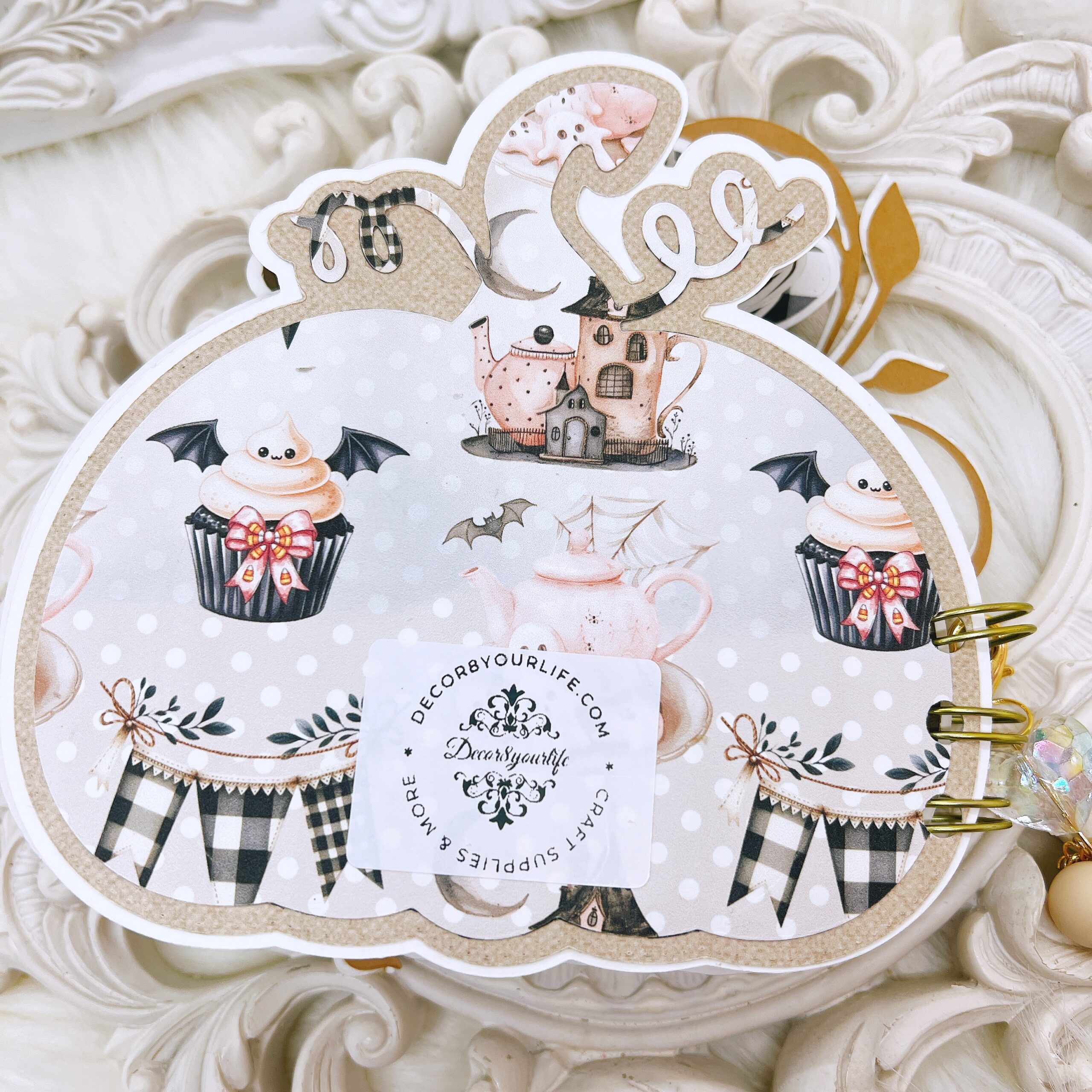 The front cover is a statement piece, layered with Summerween fussy-cuts, flourish diecuts, and gold-tone pearl accents. A removable charm, attached with a clip, adds a playful touch to your mini album, making it an ideal Halloween keepsake or gift for craft lovers.