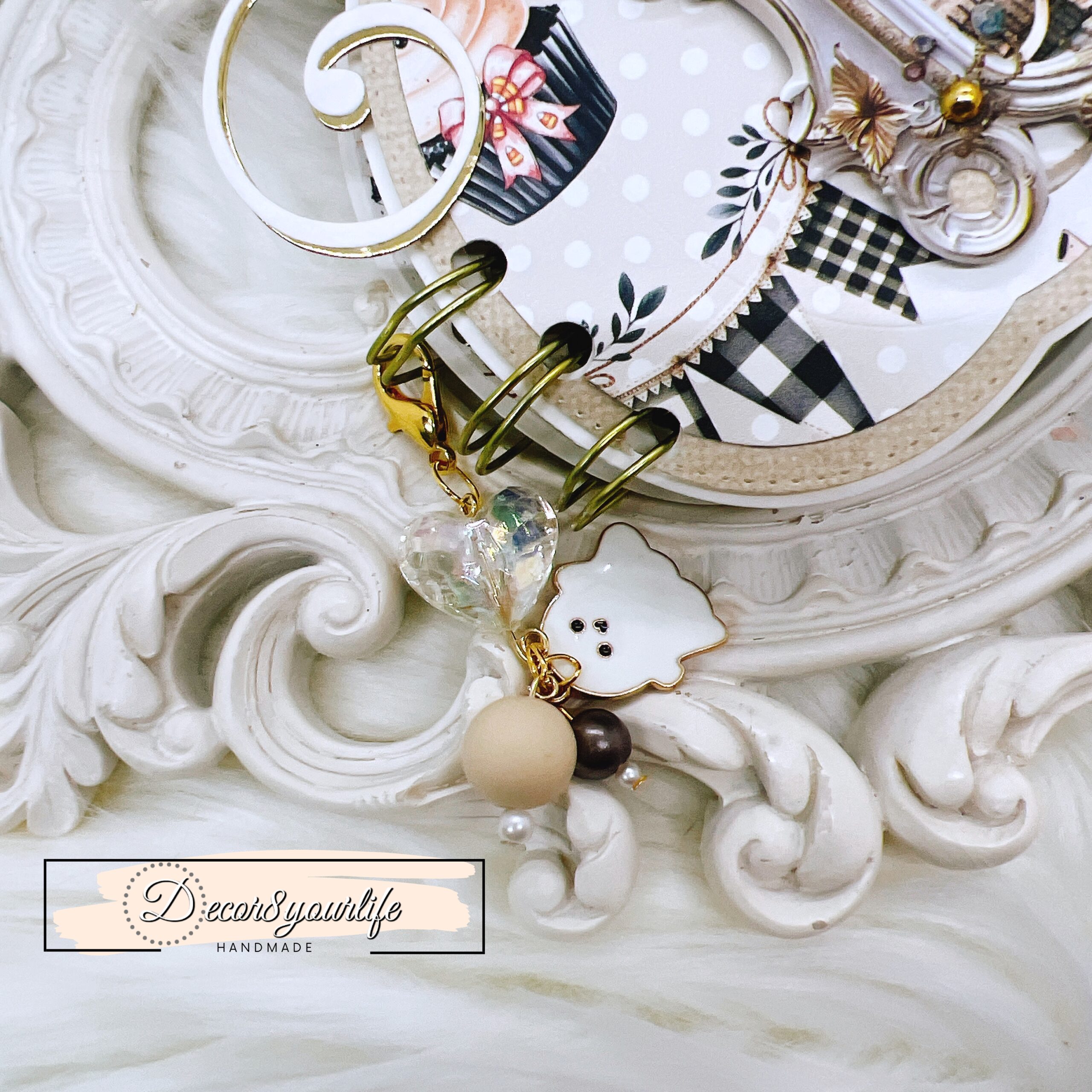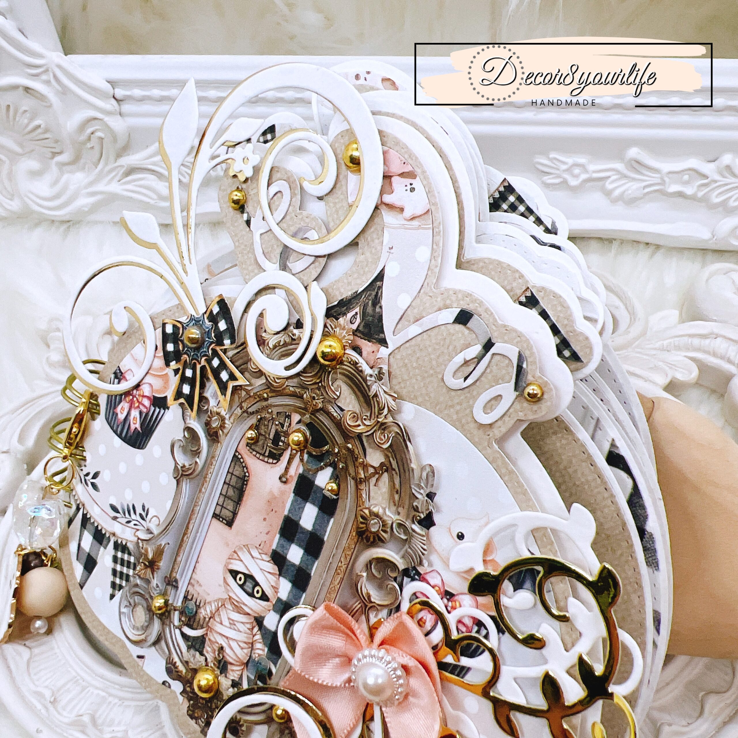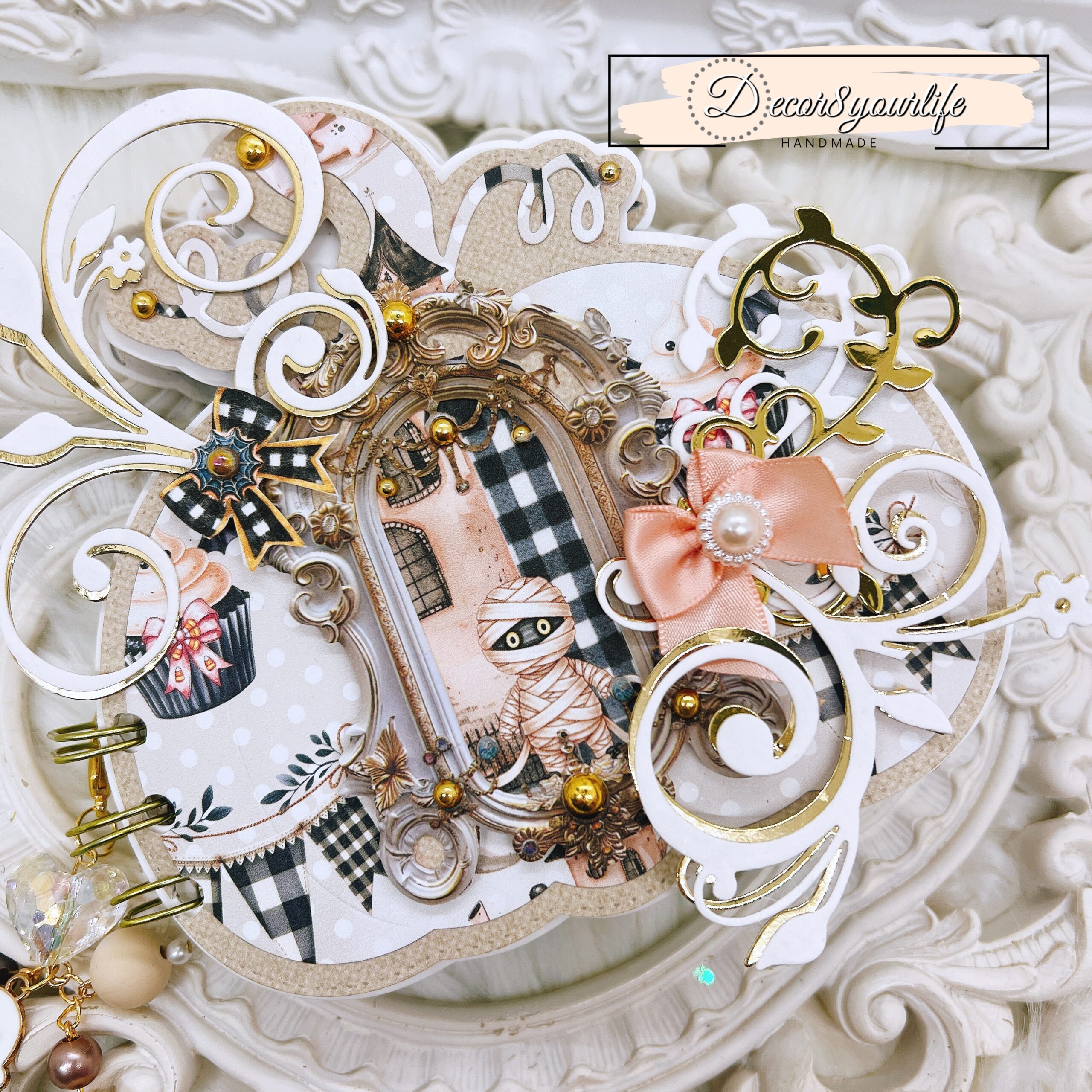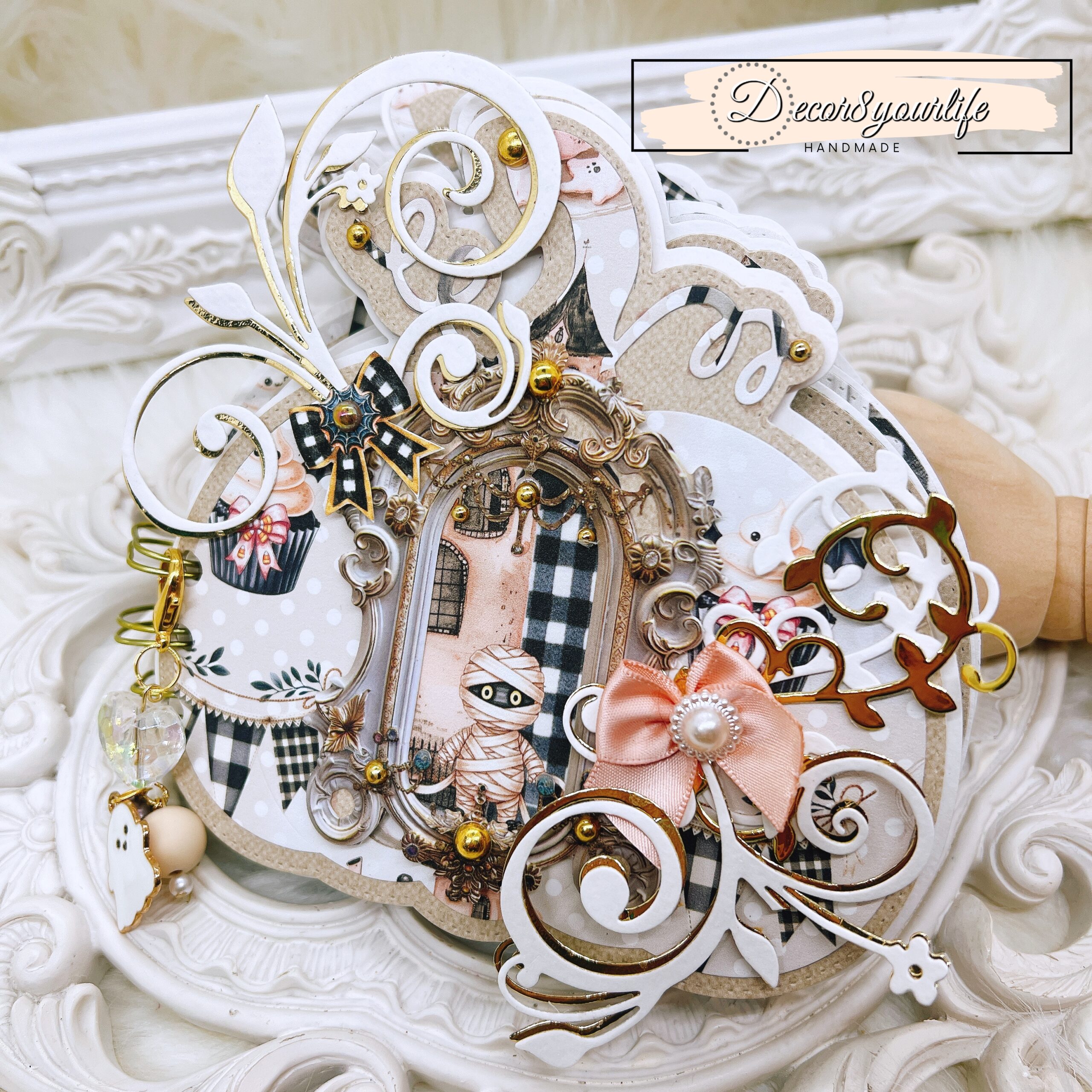 The front cover is a statement piece, layered with Summerween fussy-cuts, flourish diecuts, and gold-tone pearl accents. A removable charm, attached with a clip, adds a playful touch to your mini album, making it an ideal Halloween keepsake or gift for craft lovers.