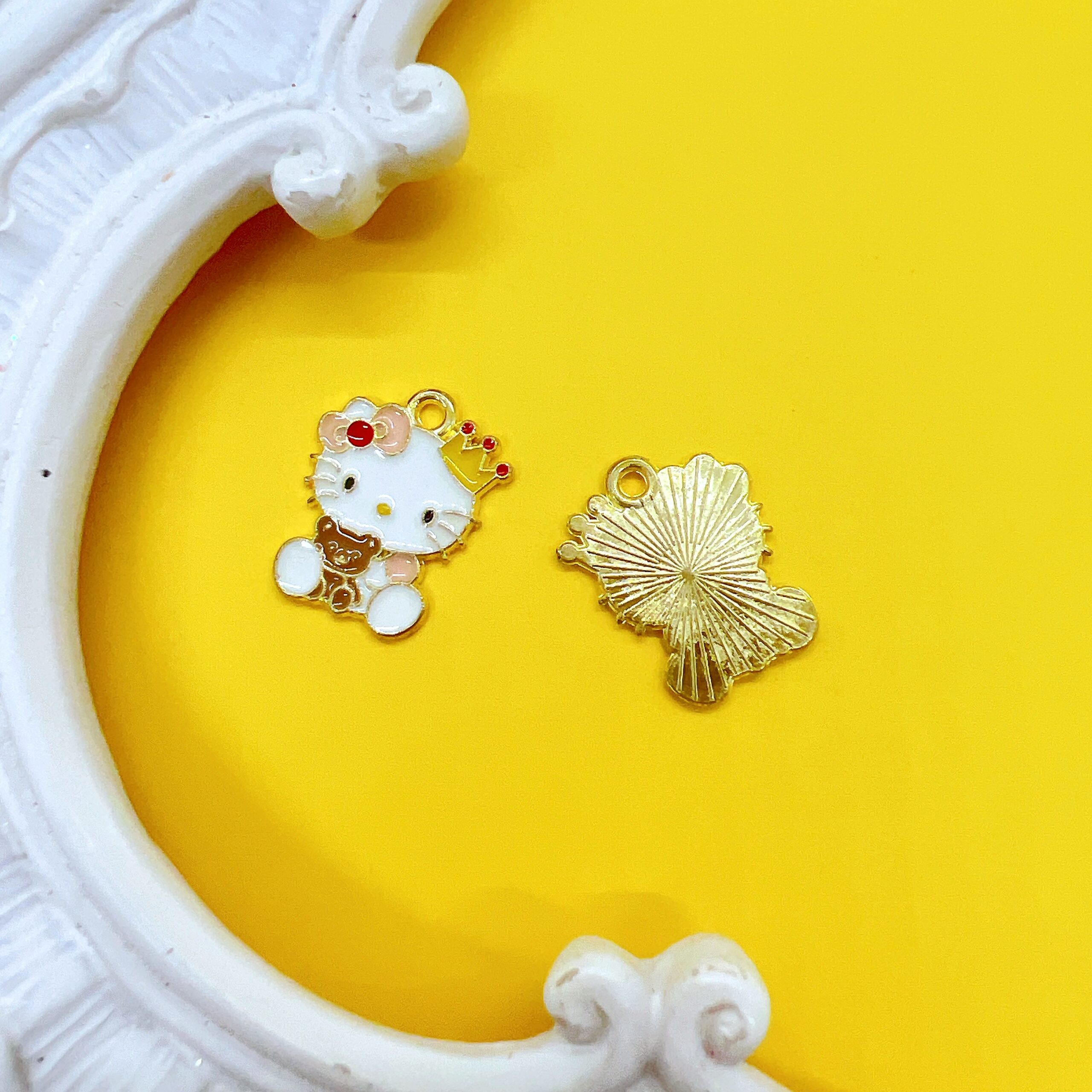 These officially licensed Hello Kitty charms by Sanrio are a sweet addition to any craft stash. Each charm measures approximately 3/4 x 3/4 inches and features a smooth enamel front in yellow and pink tones with a polished gold-tone metal back. The attached loop makes them easy to add to jewelry, planners, and handmade accessories without extra drilling.