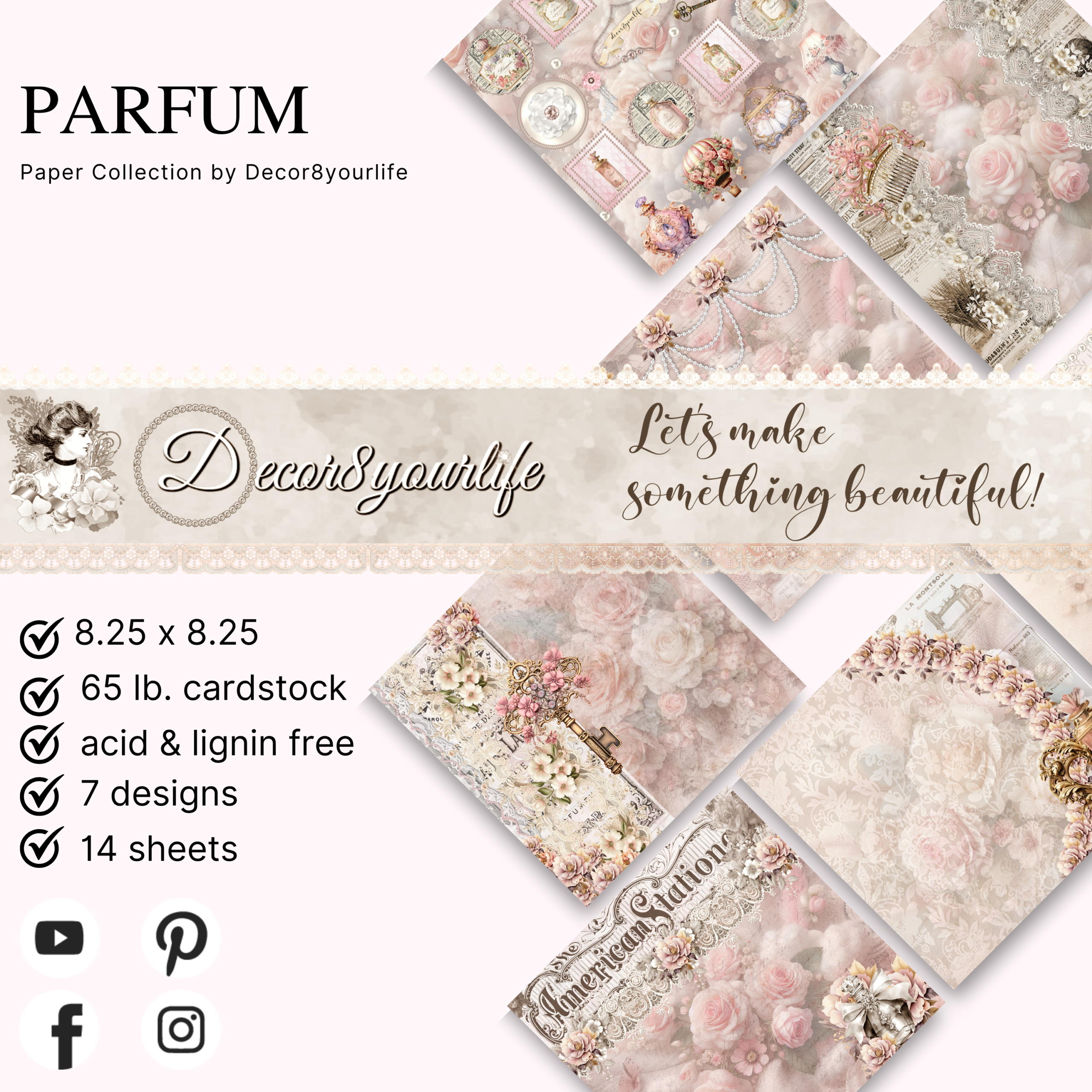 Discover the Parfum scrapbook paper collection by Decor8yourlife. This 7-page shabby chic set, printed on 65 lb. lignin and acid-free cardstock, is perfect for any paper crafting project. Elegance meets versatility!