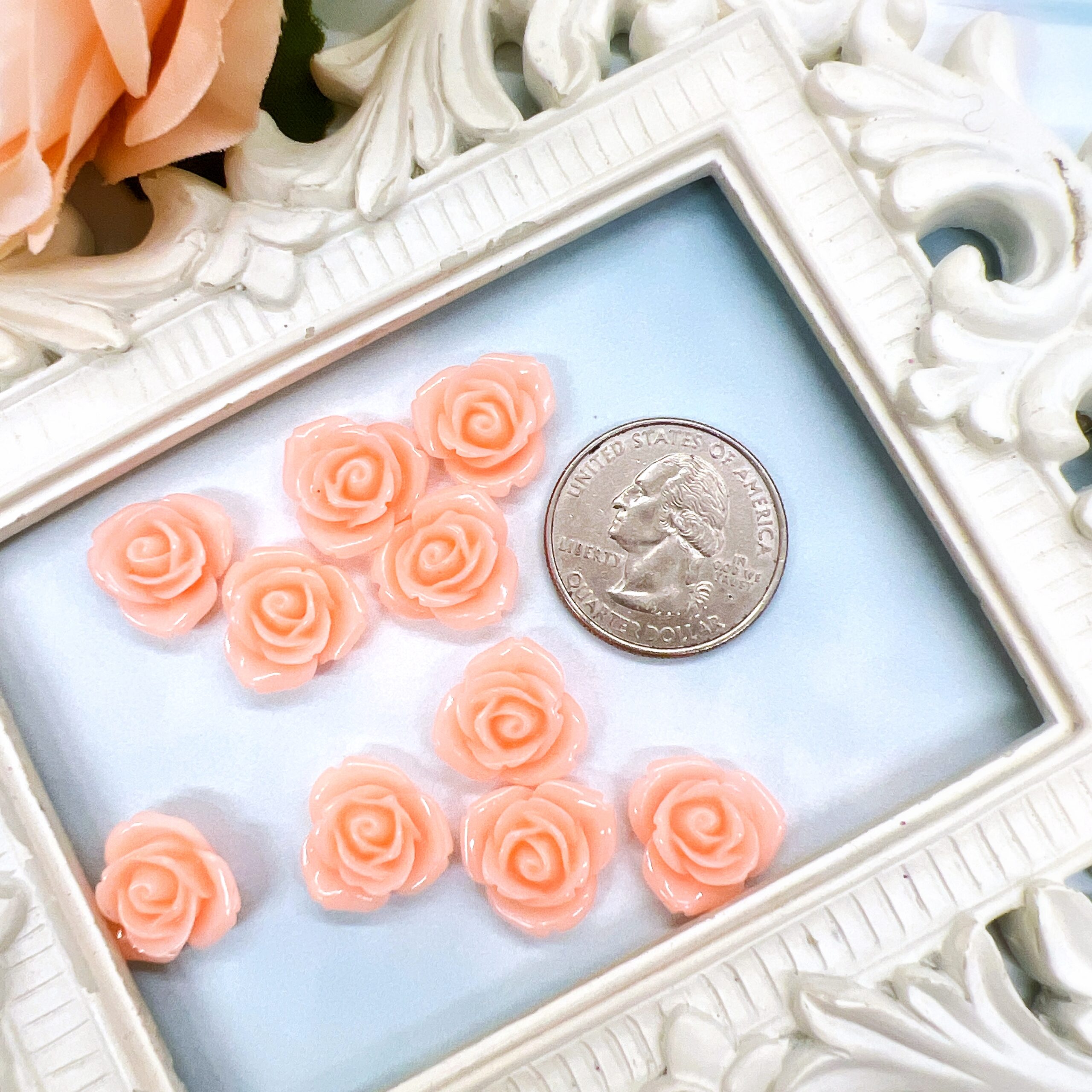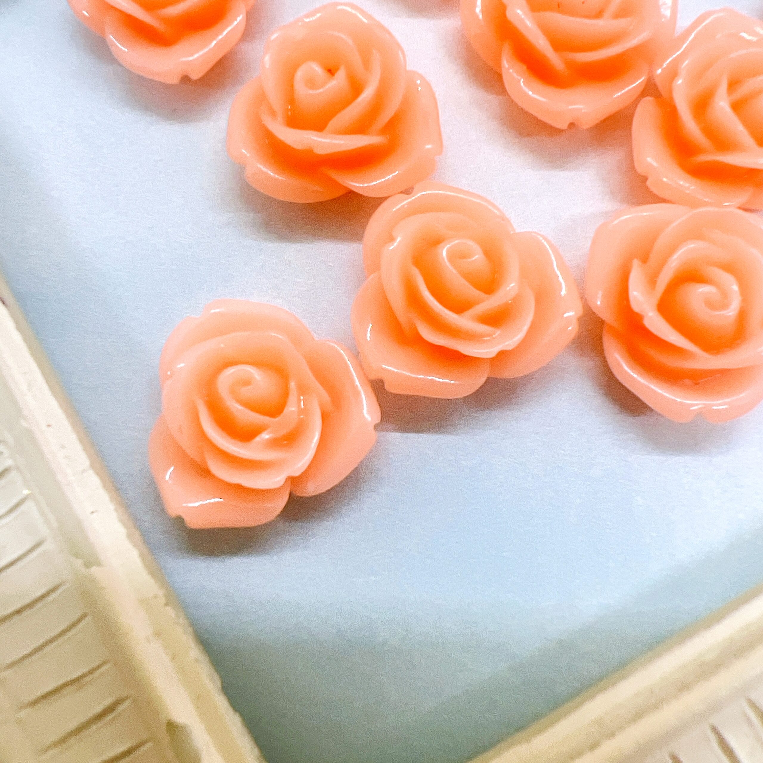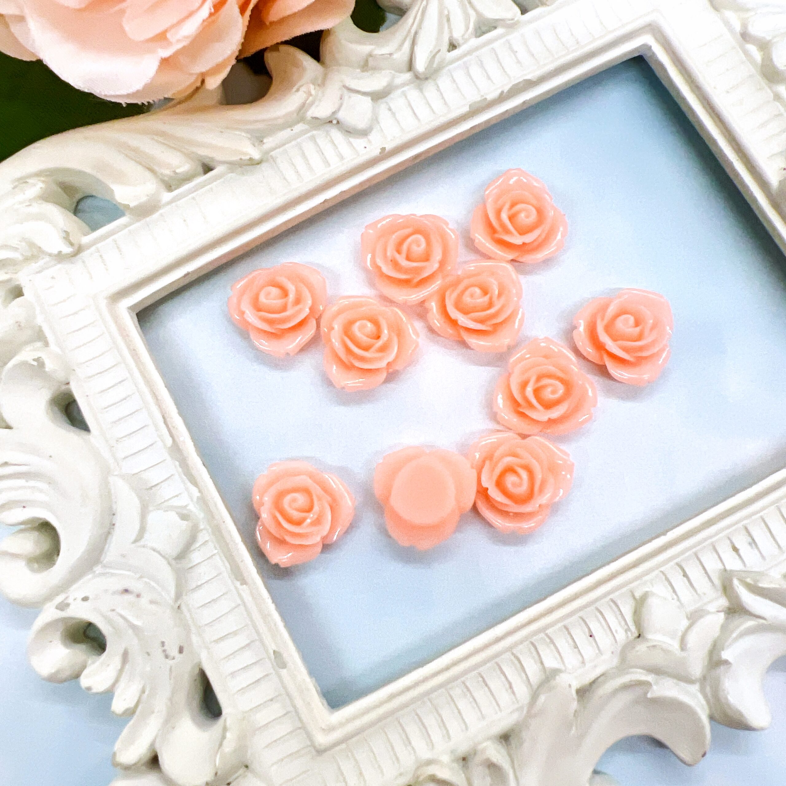 These flat back flowers measure approximately 1/2 inch, making them ideal for detailed craft work where full size embellishments would feel too heavy. The soft peach petals give these flowers a romantic spring aesthetic that works beautifully in shabby chic, vintage, cottage-core and feminine craft themes.
