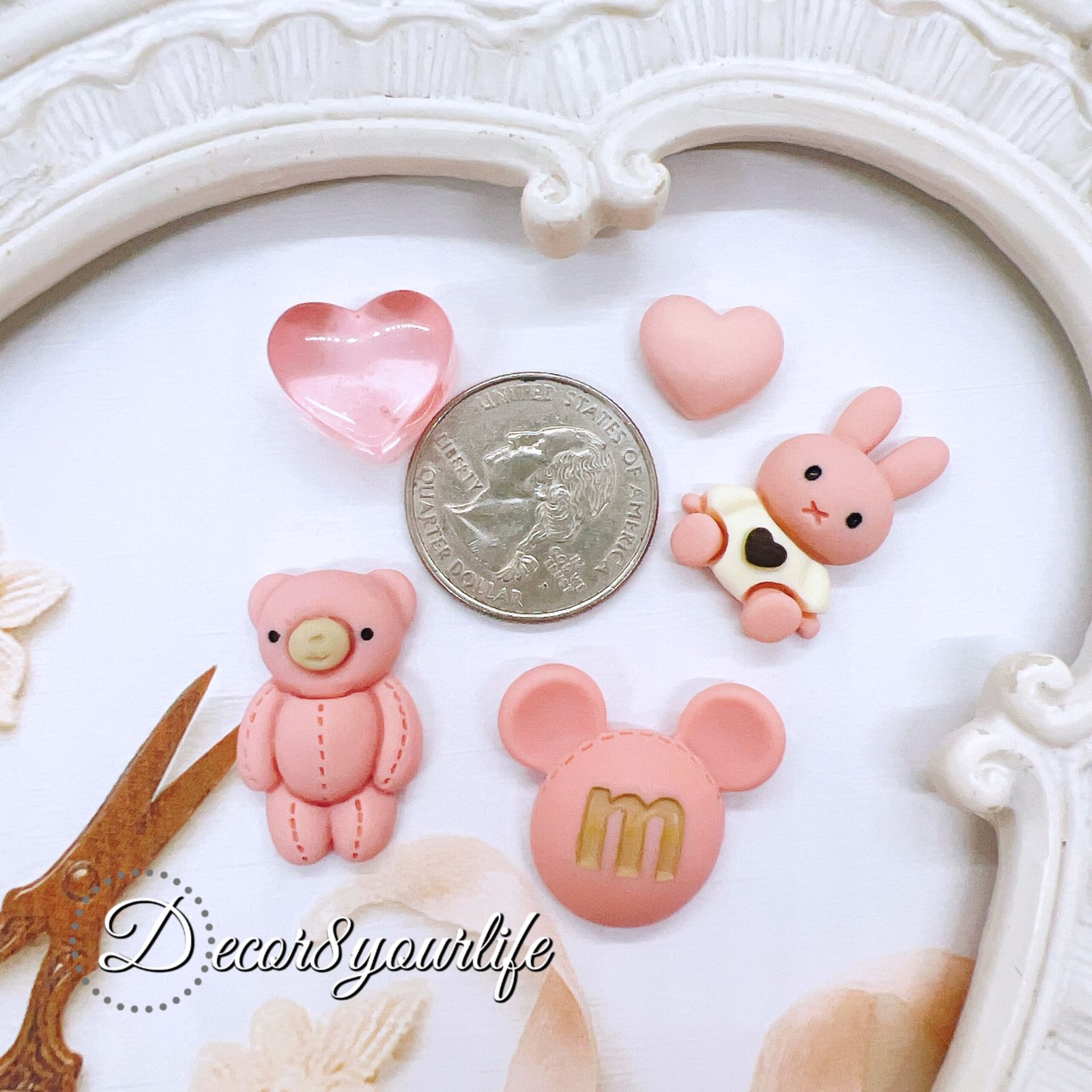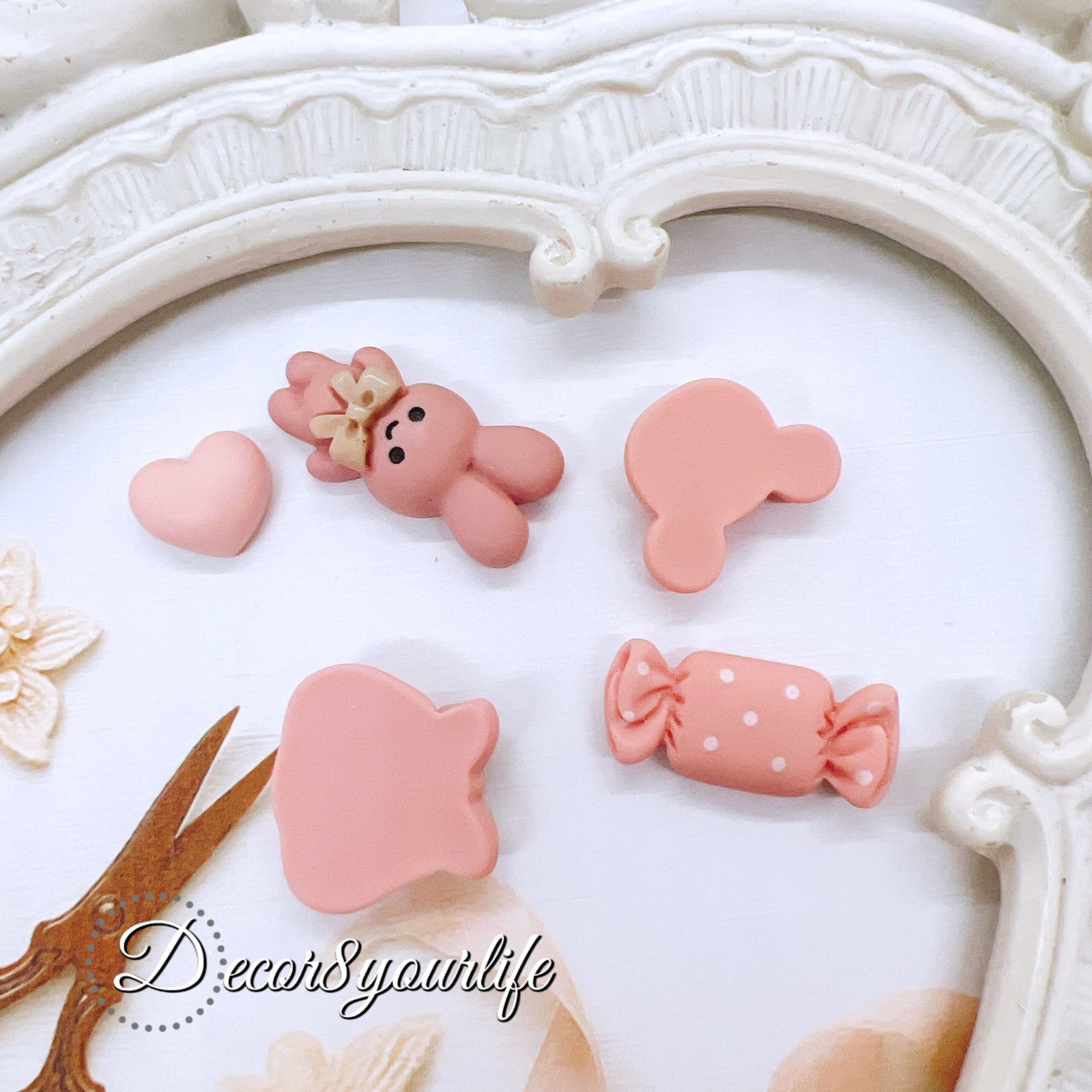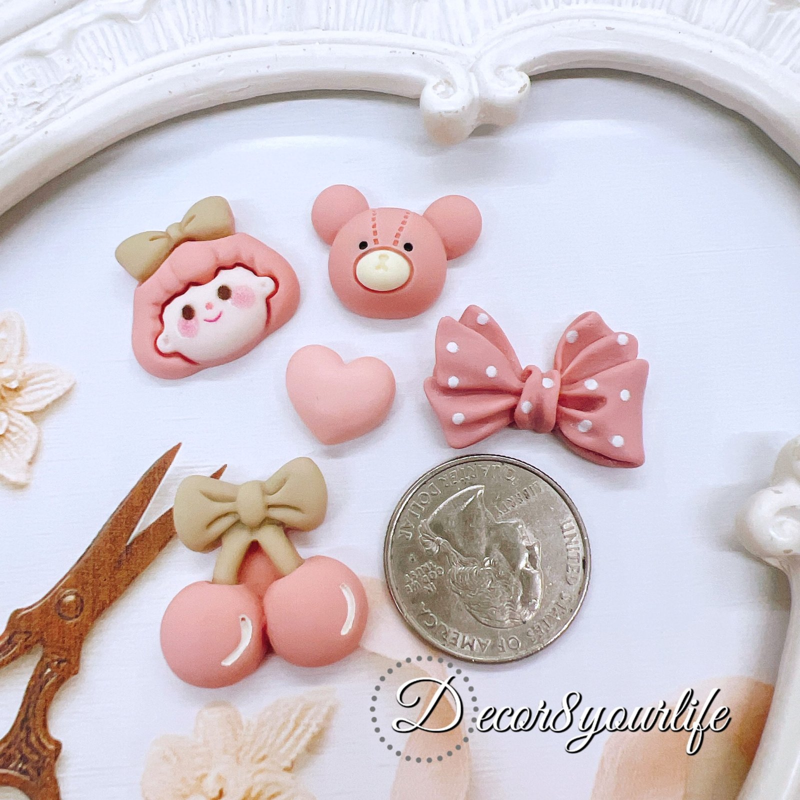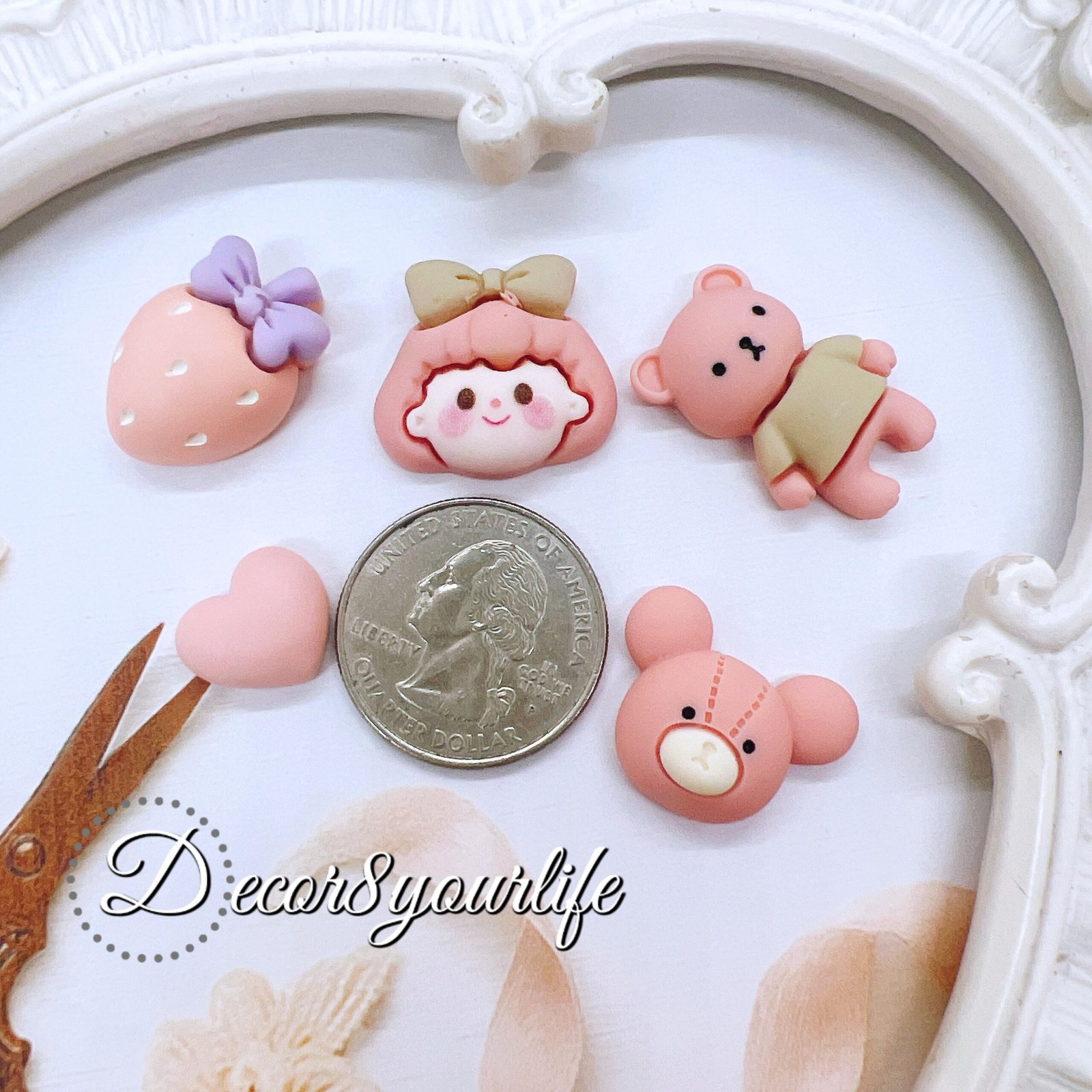 Bring a pop of color and personality to your creative projects with this delightful set of five resin flat-back cabochons. Each pack comes with a mix of small, kawaii-style shapes — from cute characters and strawberries to bows, candies, and other adorable mini designs.