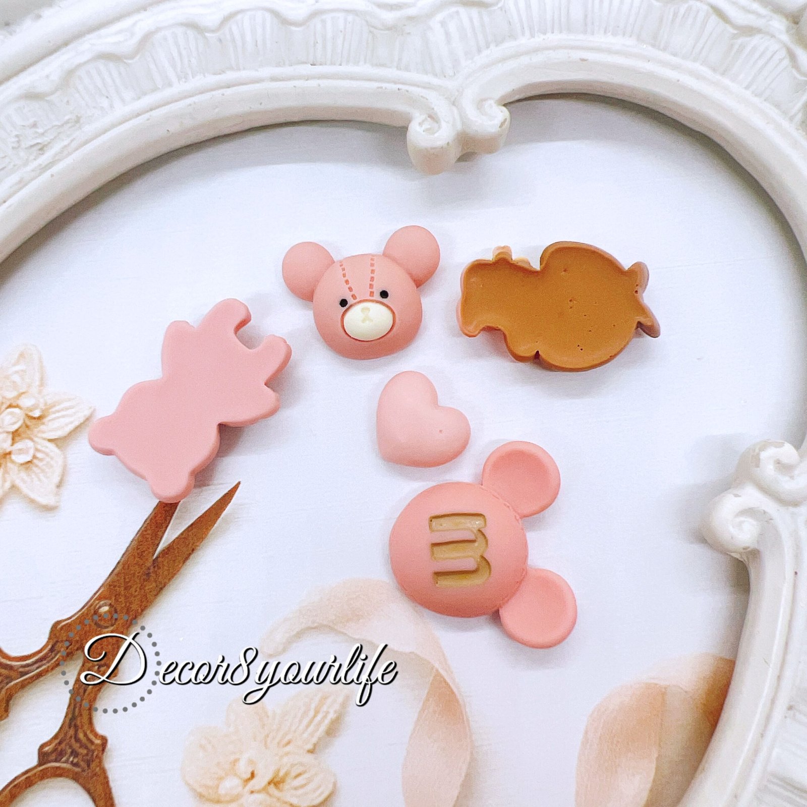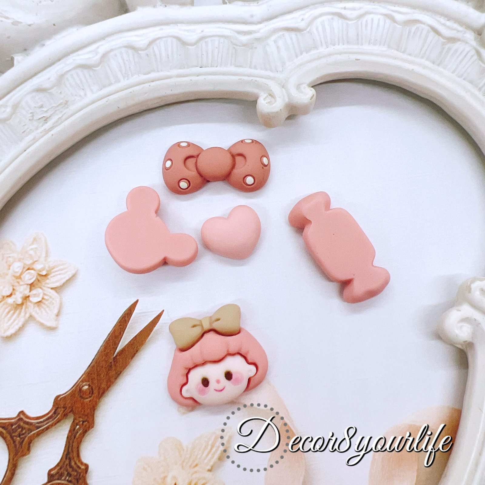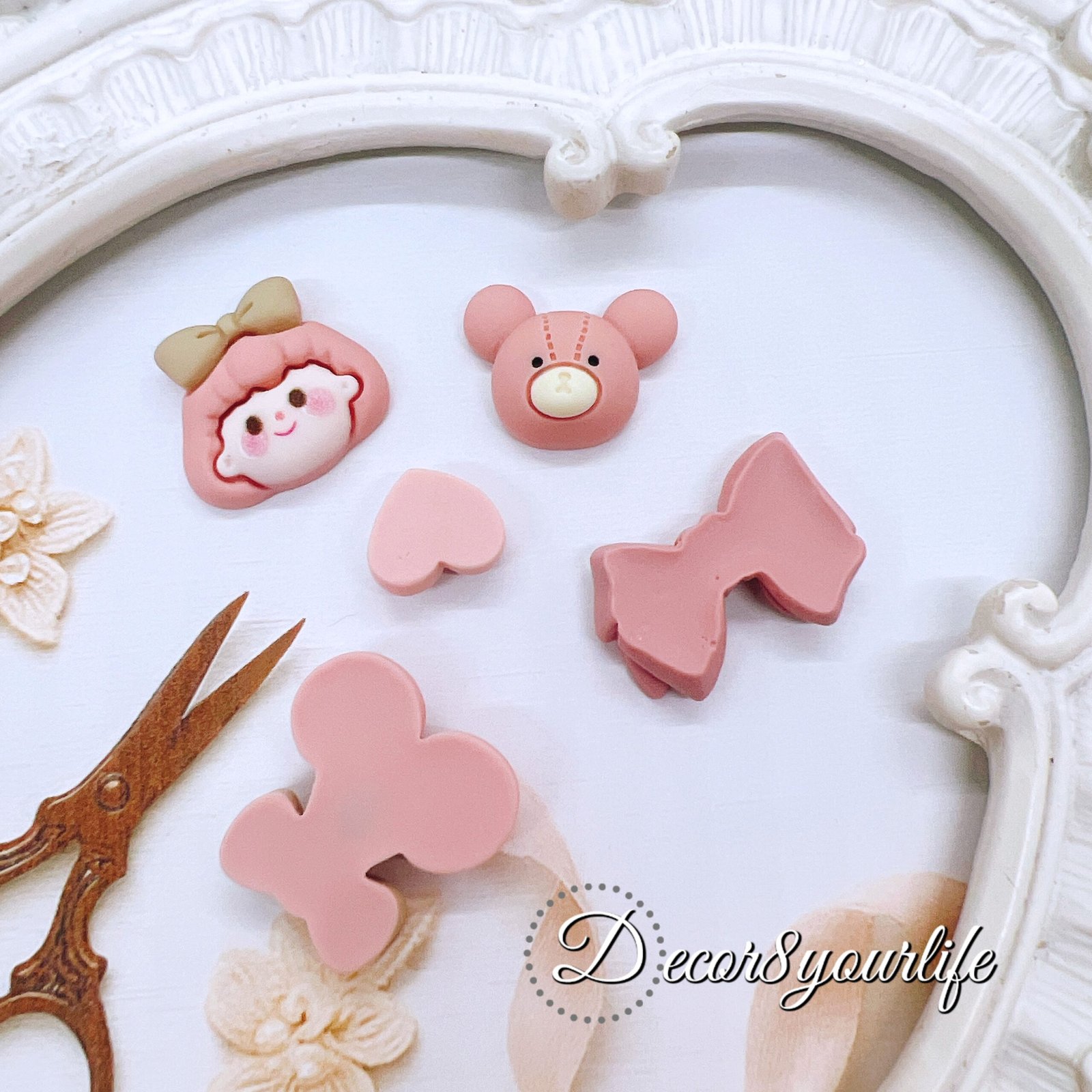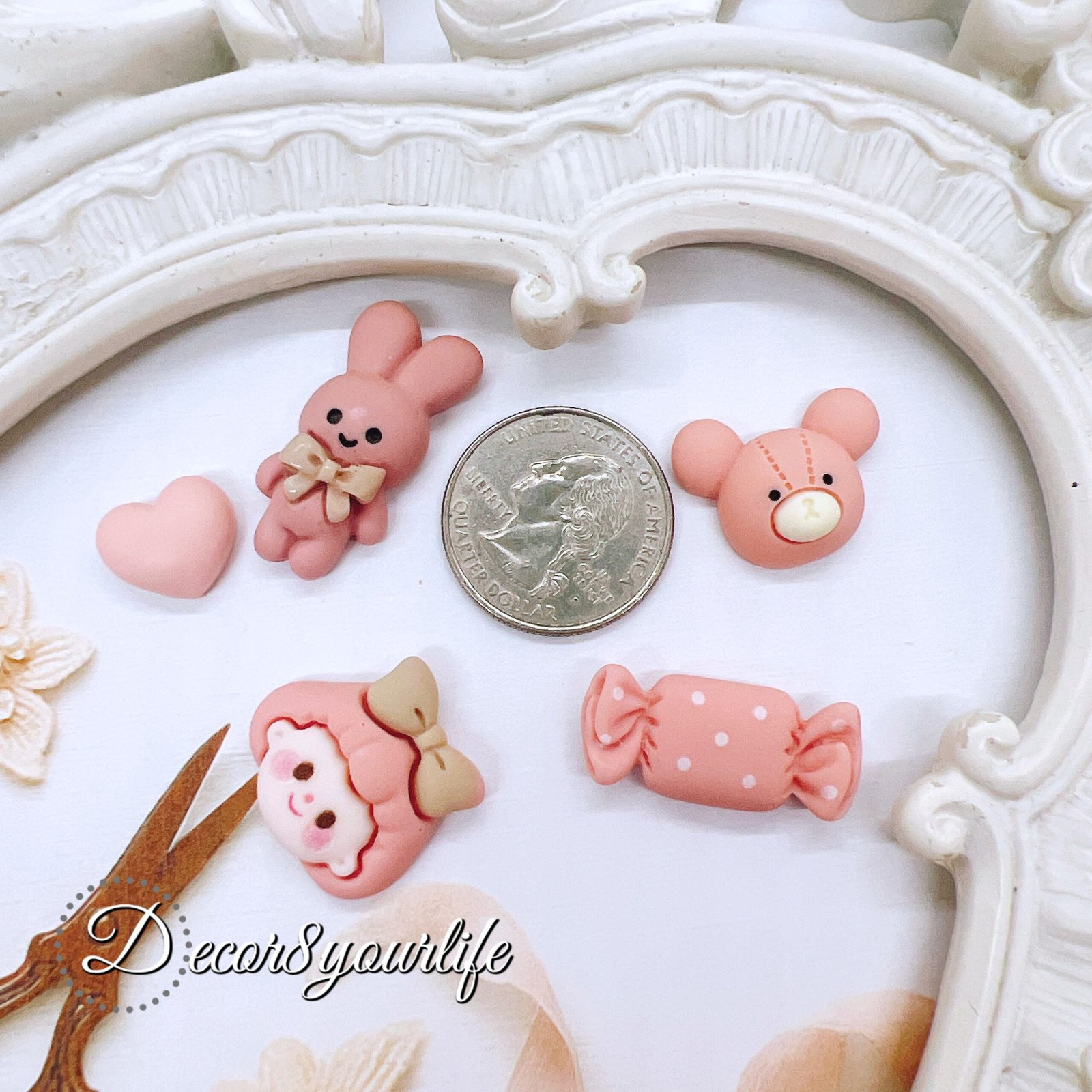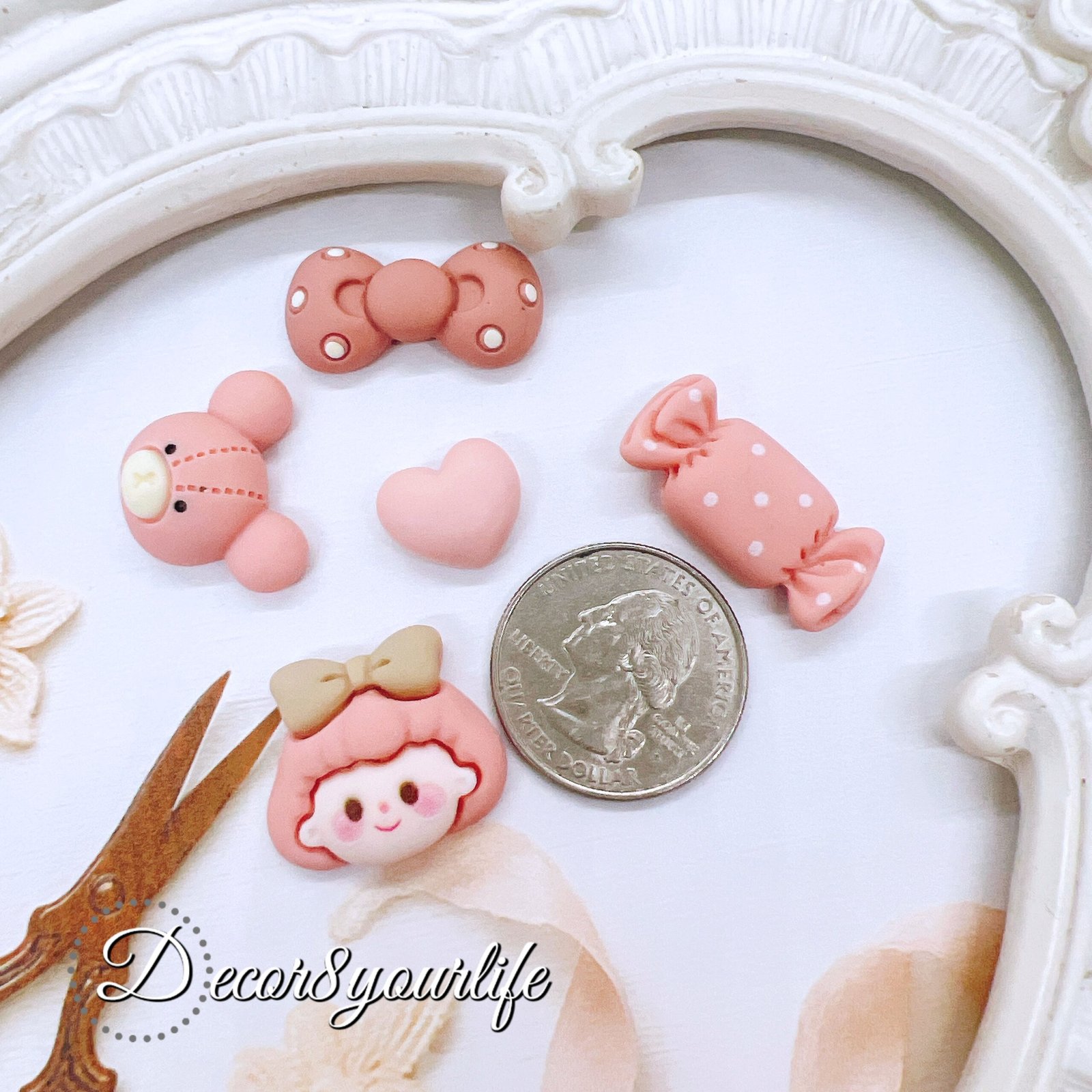 Bring a pop of color and personality to your creative projects with this delightful set of five resin flat-back cabochons. Each pack comes with a mix of small, kawaii-style shapes — from cute characters and strawberries to bows, candies, and other adorable mini designs.