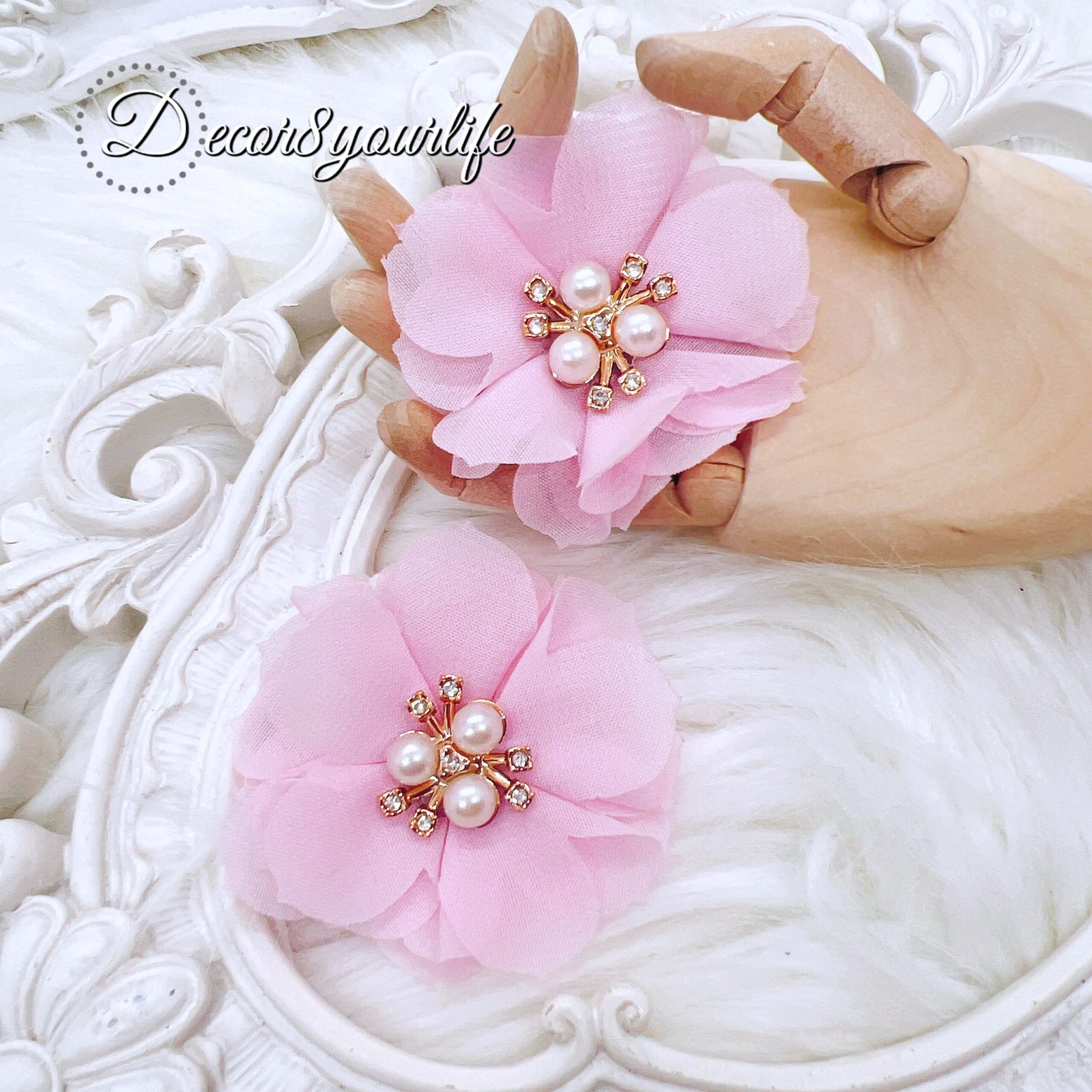 Pink Set of 2 Chiffon Flower Embellishments with Rhinestone Centers – Elegant Shabby Chic Craft Supplies