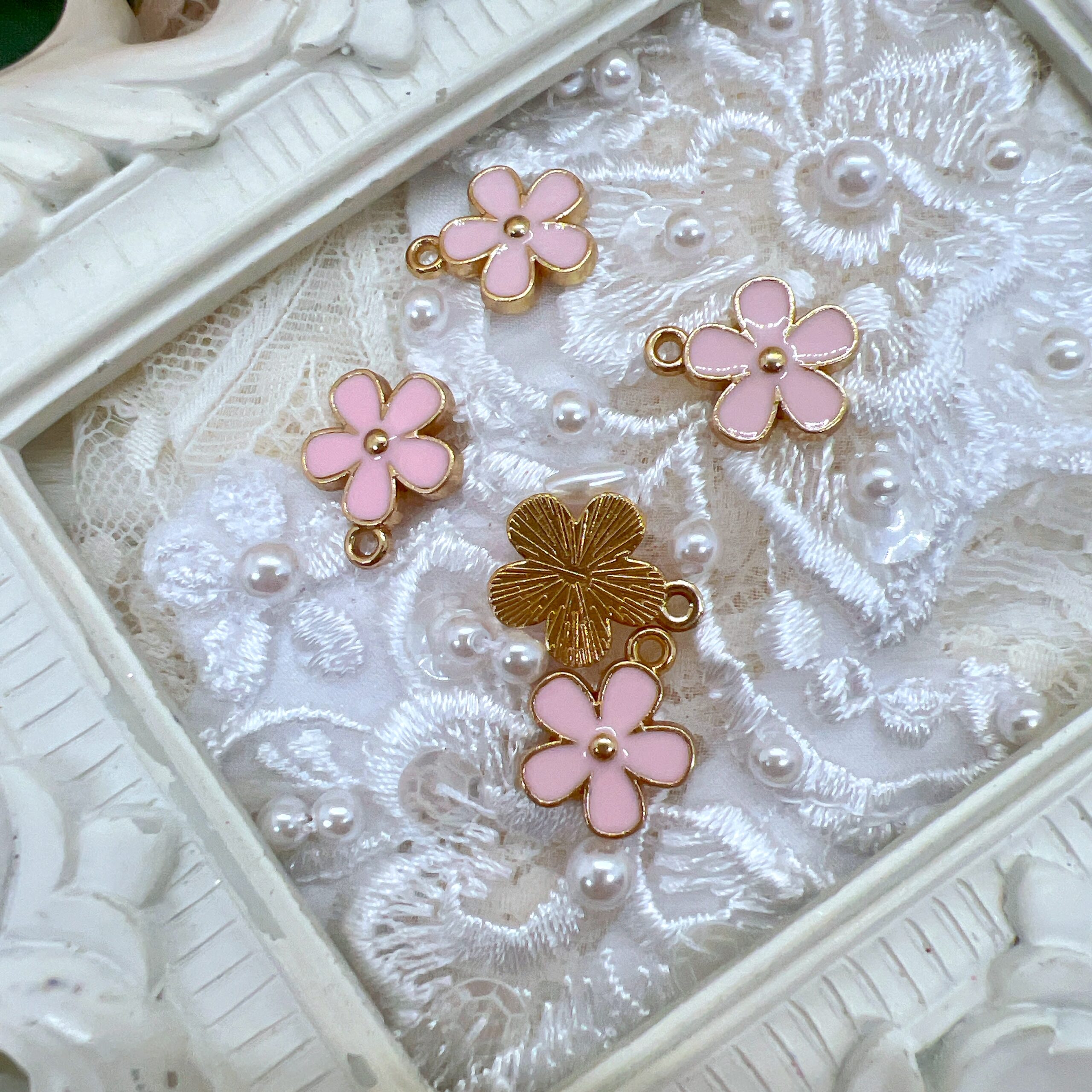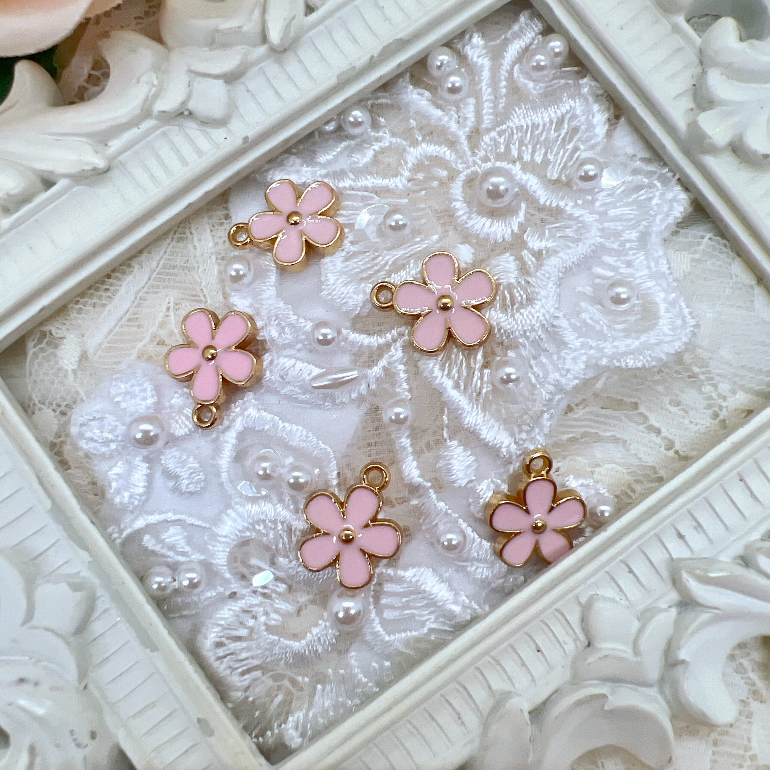 This beautiful set of five pink enamel charms is perfect for adding a soft, feminine touch to your creative projects. Featuring daisy flower style in a lovely pink color palette with gold-tone accents, these charms are ideal for junk journals, mini albums, scrapbooks, handmade cards, altered art, planners, and mixed-media designs.