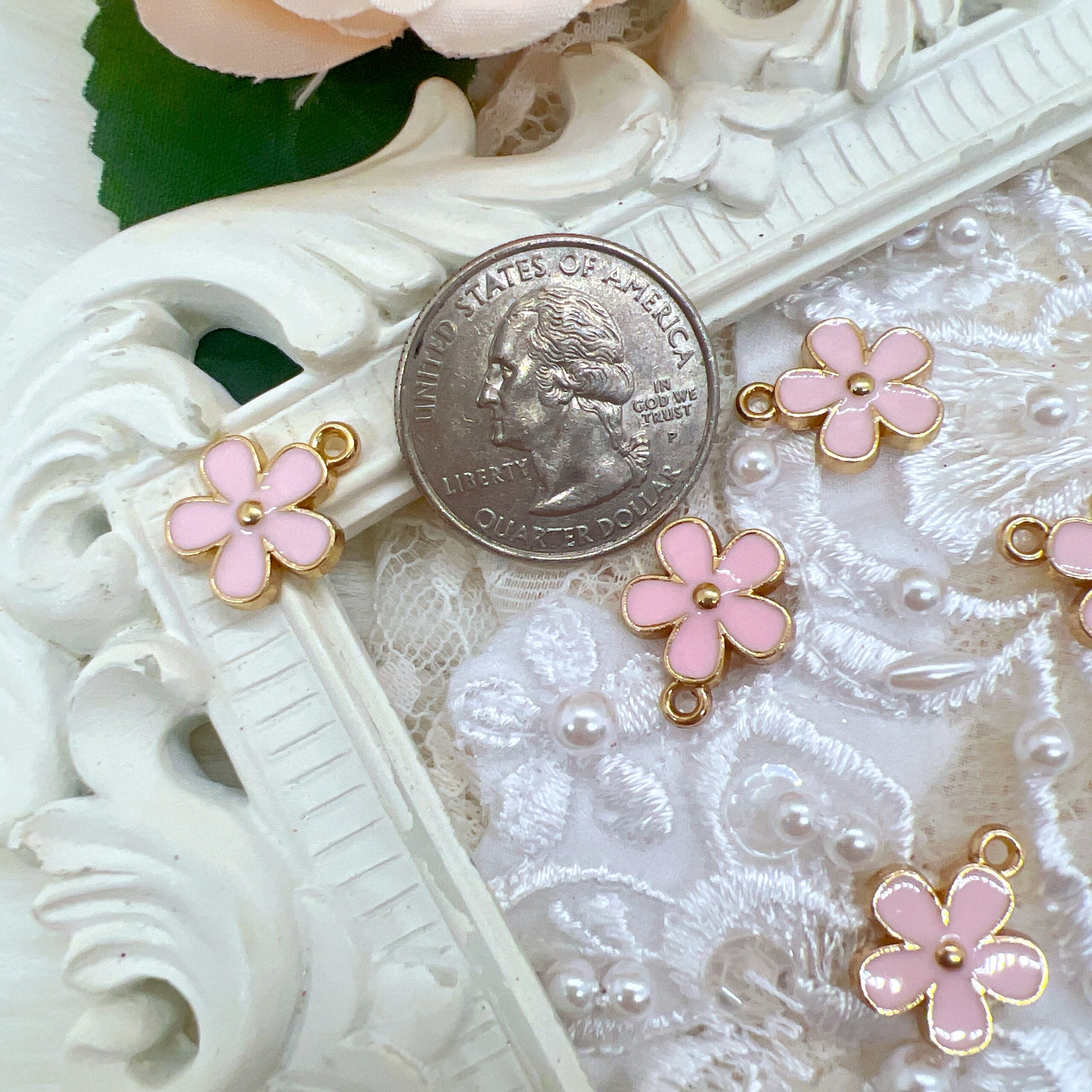 Each charm measures approximately half an inch in size, making them a wonderful focal point for dangles, tassels, bookmarks, zipper pulls, and charm clusters. Their delicate pastel tones and elegant detailing blend beautifully with shabby chic, vintage, Victorian, cottage-core, and romantic craft styles.