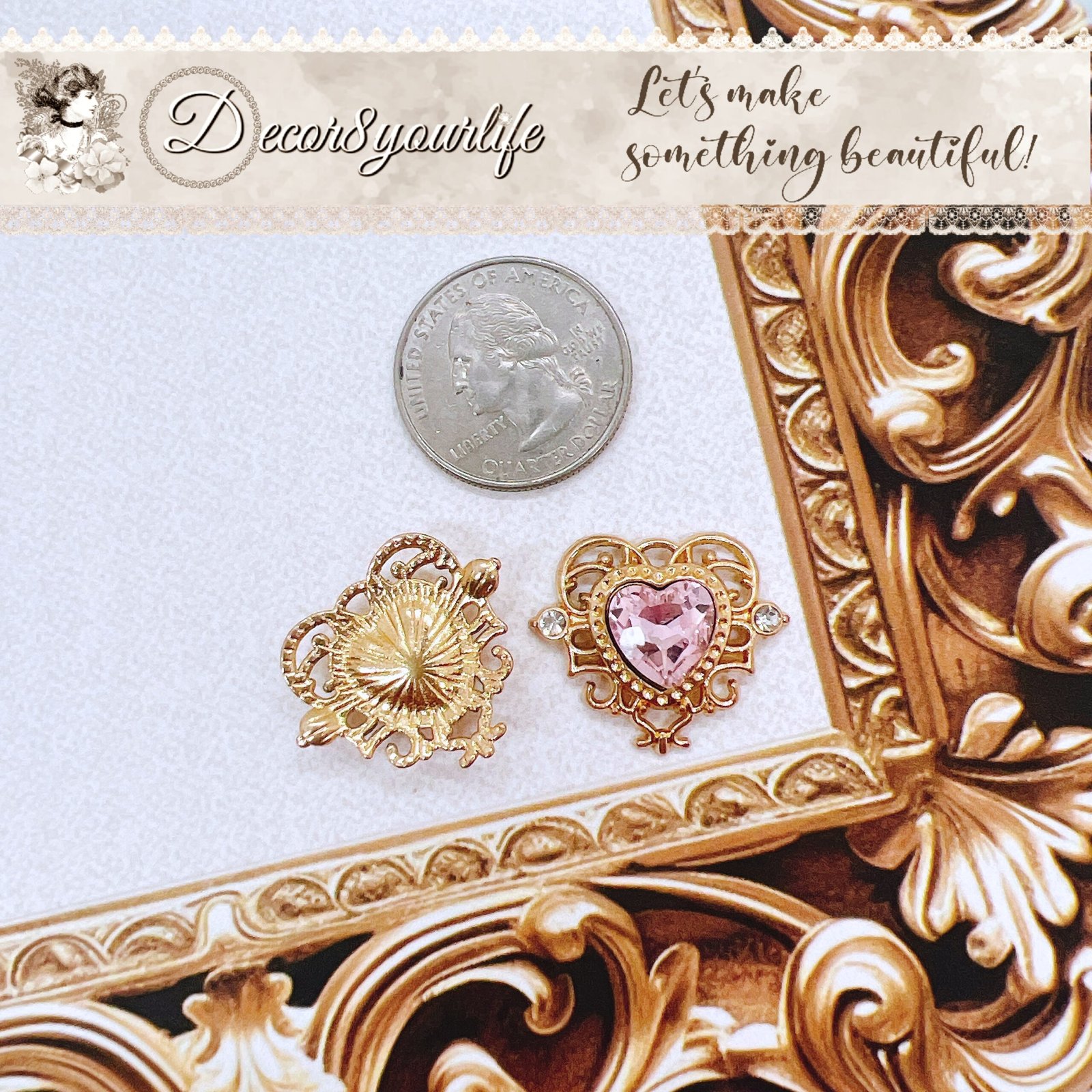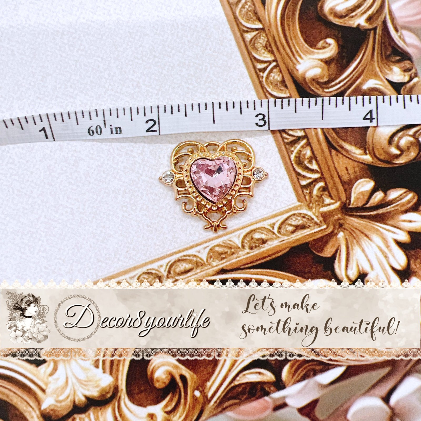 Elevate your creative projects with this romantic pink heart embellishment—an elegant flat-back accent that brings charm and sparkle. Featuring a delicate pink faux stone (think Morganite or Rose Quartz vibes) nestled in a gold-tone heart frame, each side of the heart glimmers with rhinestone accents for added brilliance. Measuring roughly one inch across, it’s perfectly sized for weddings, shabby chic crafts, or home décor accents.