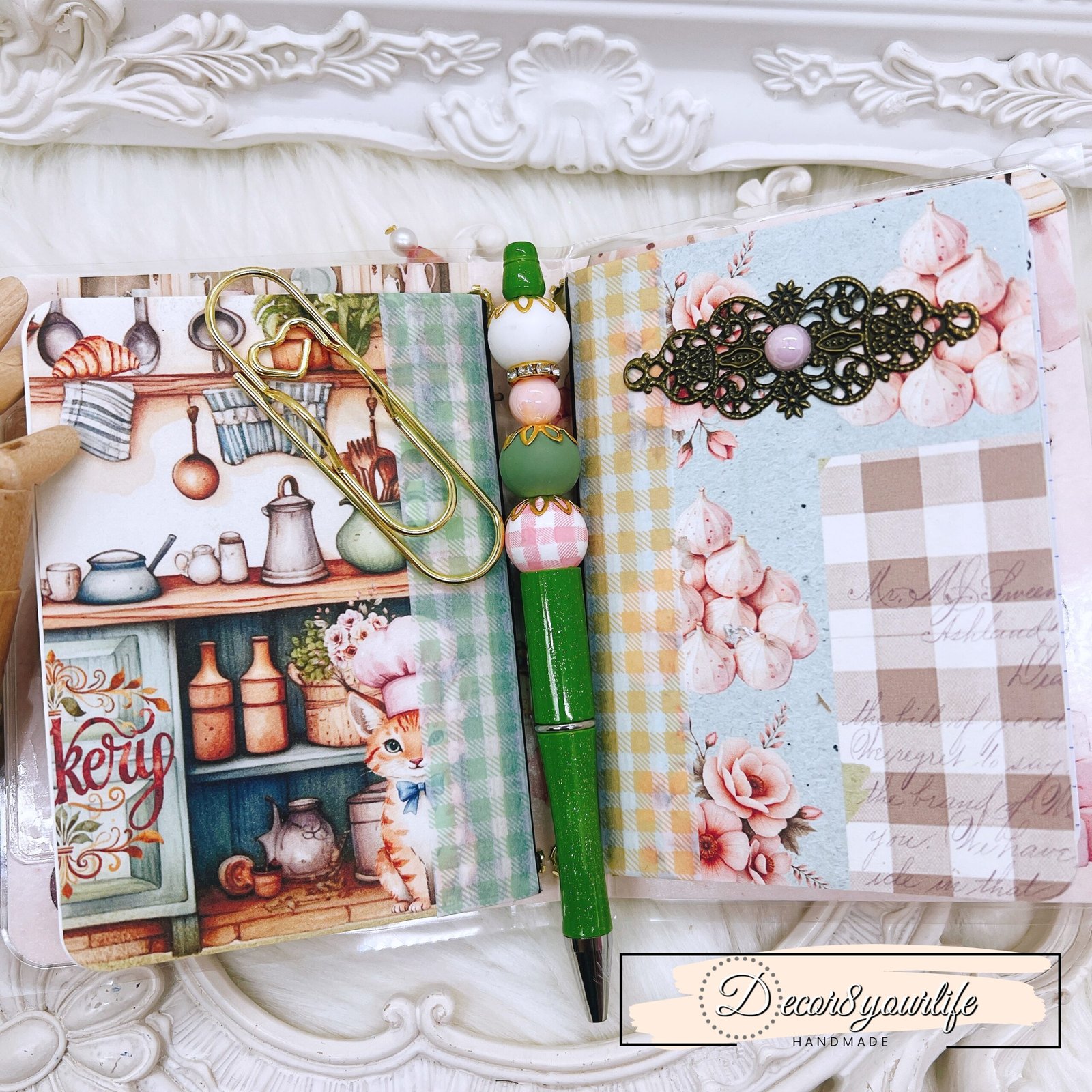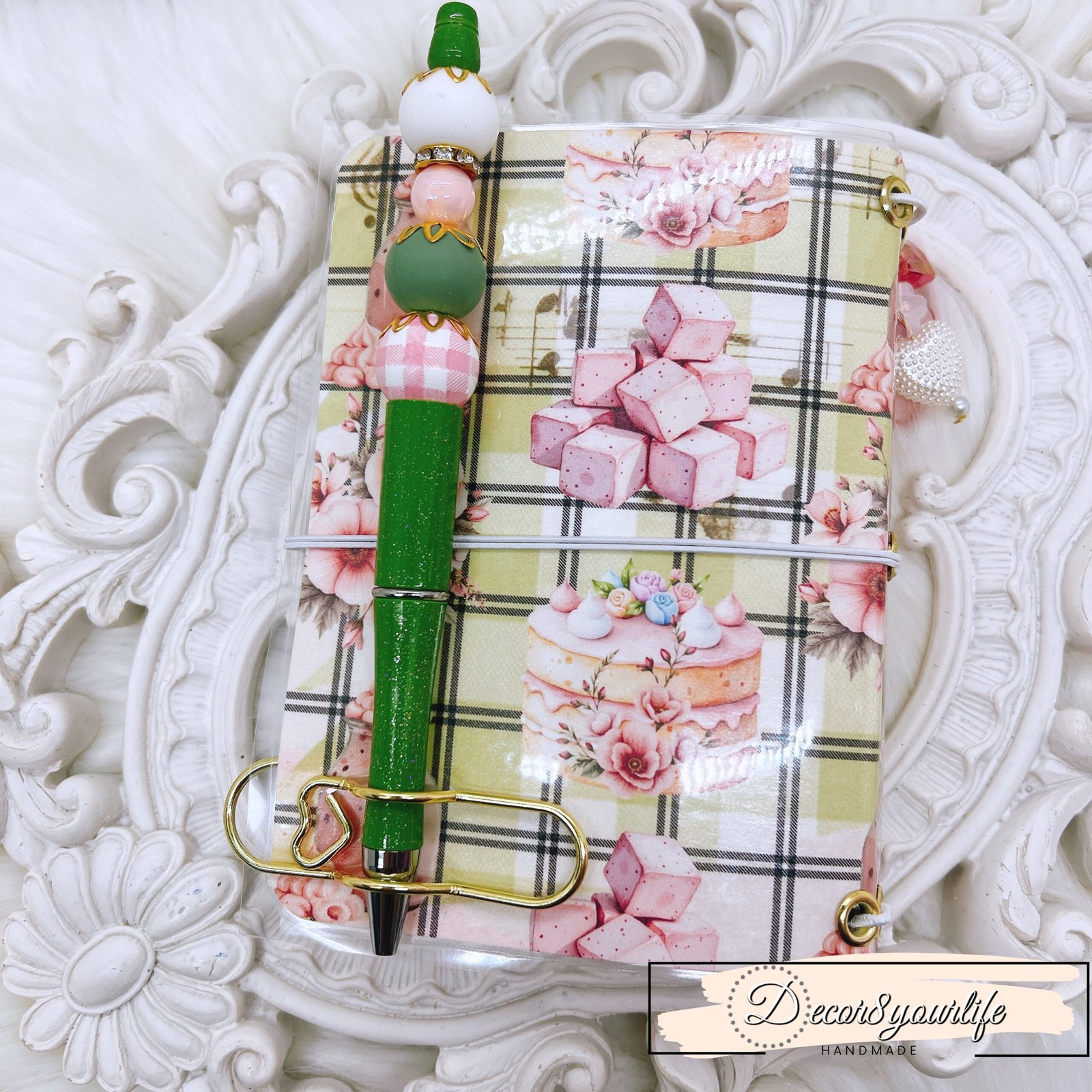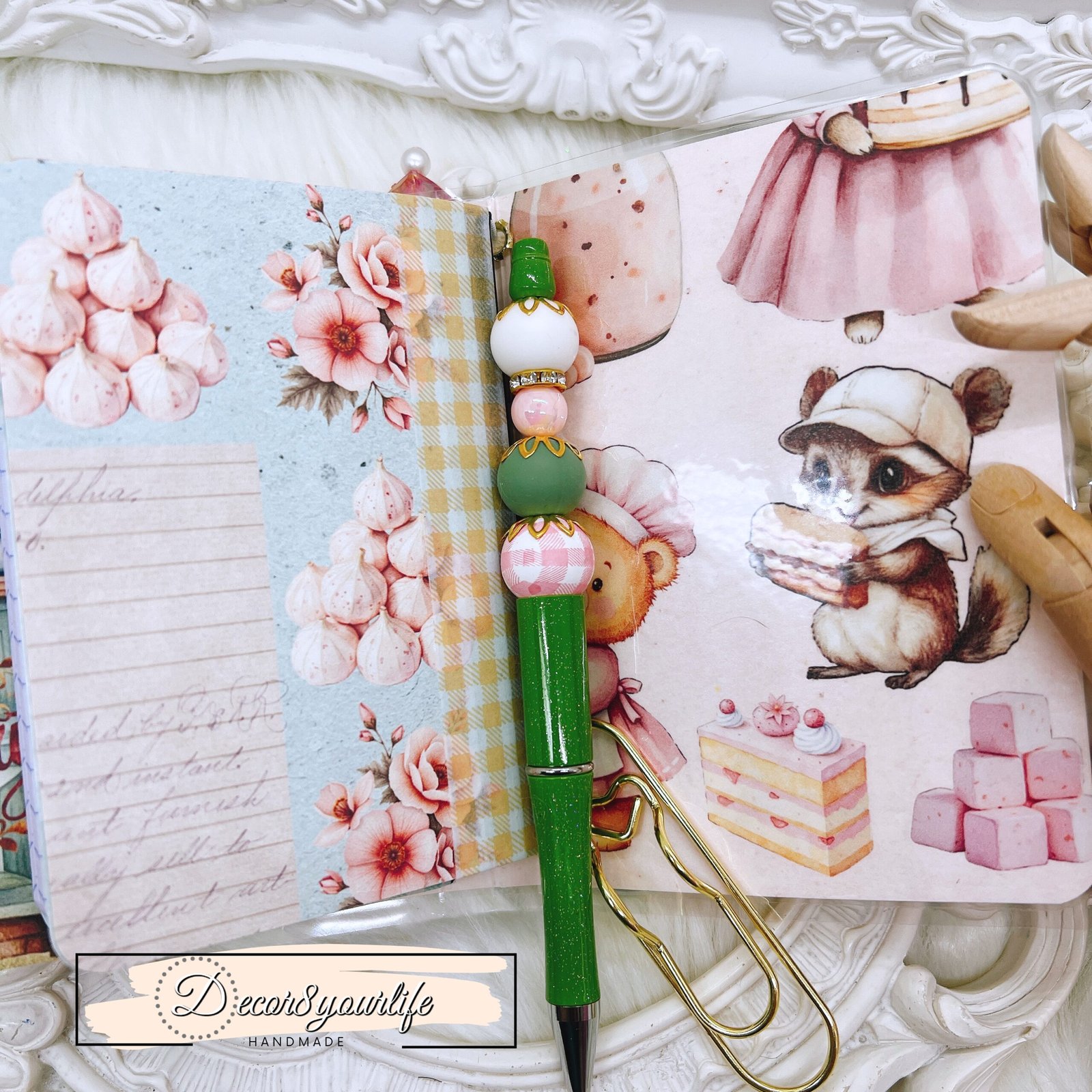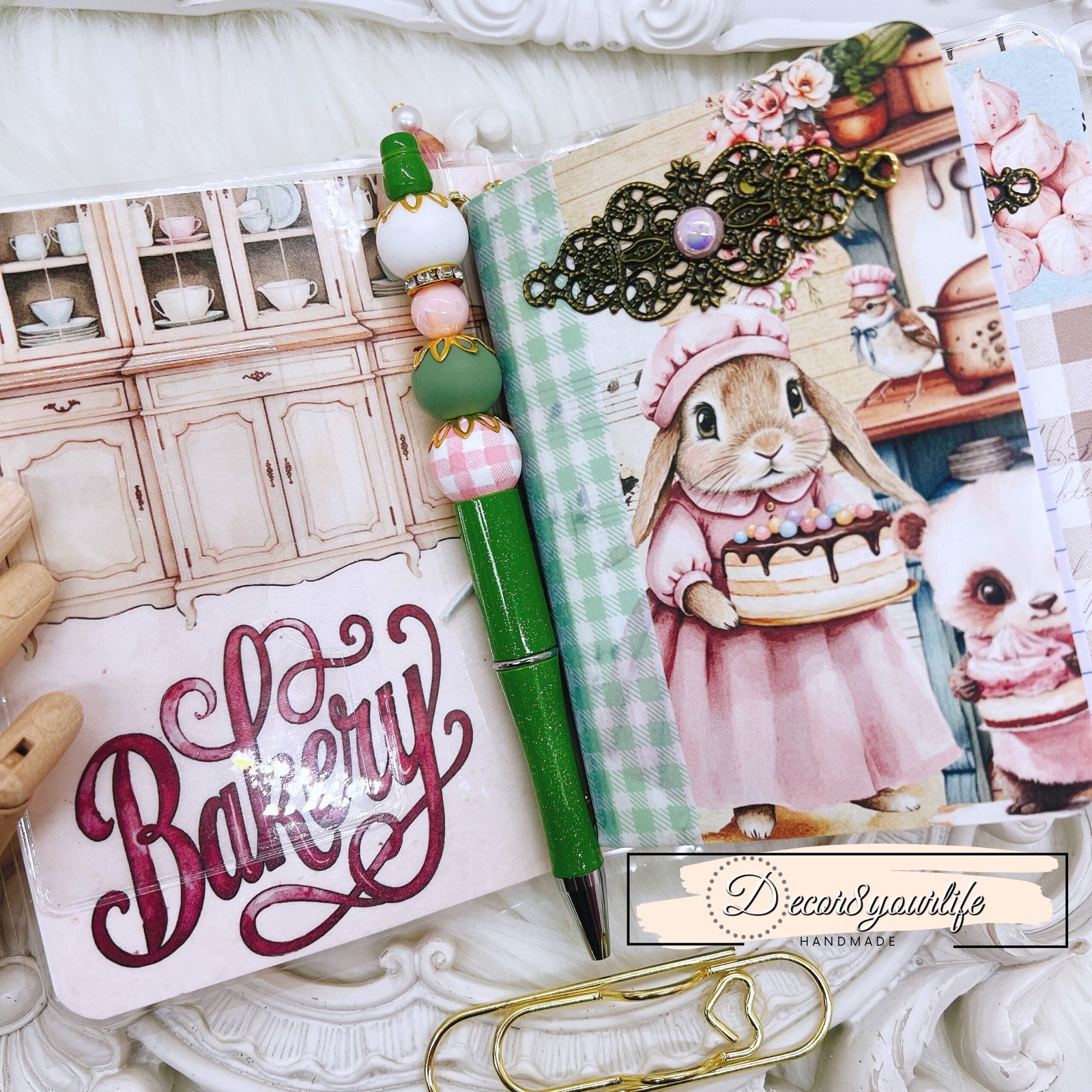 This traveler’s notebook is covered in a laminated dessert and floral print from our Bunny Bakes & Pantry Tales paper collection, ensuring durability while keeping the whimsical bakery aesthetic. The chunky charm cluster on the spine adds personality and makes this TN stand out in your collection. Paired with a handmade beaded pen and a gold-tone paperclip that doubles as a pen holder, this set is thoughtfully put together to inspire creativity.