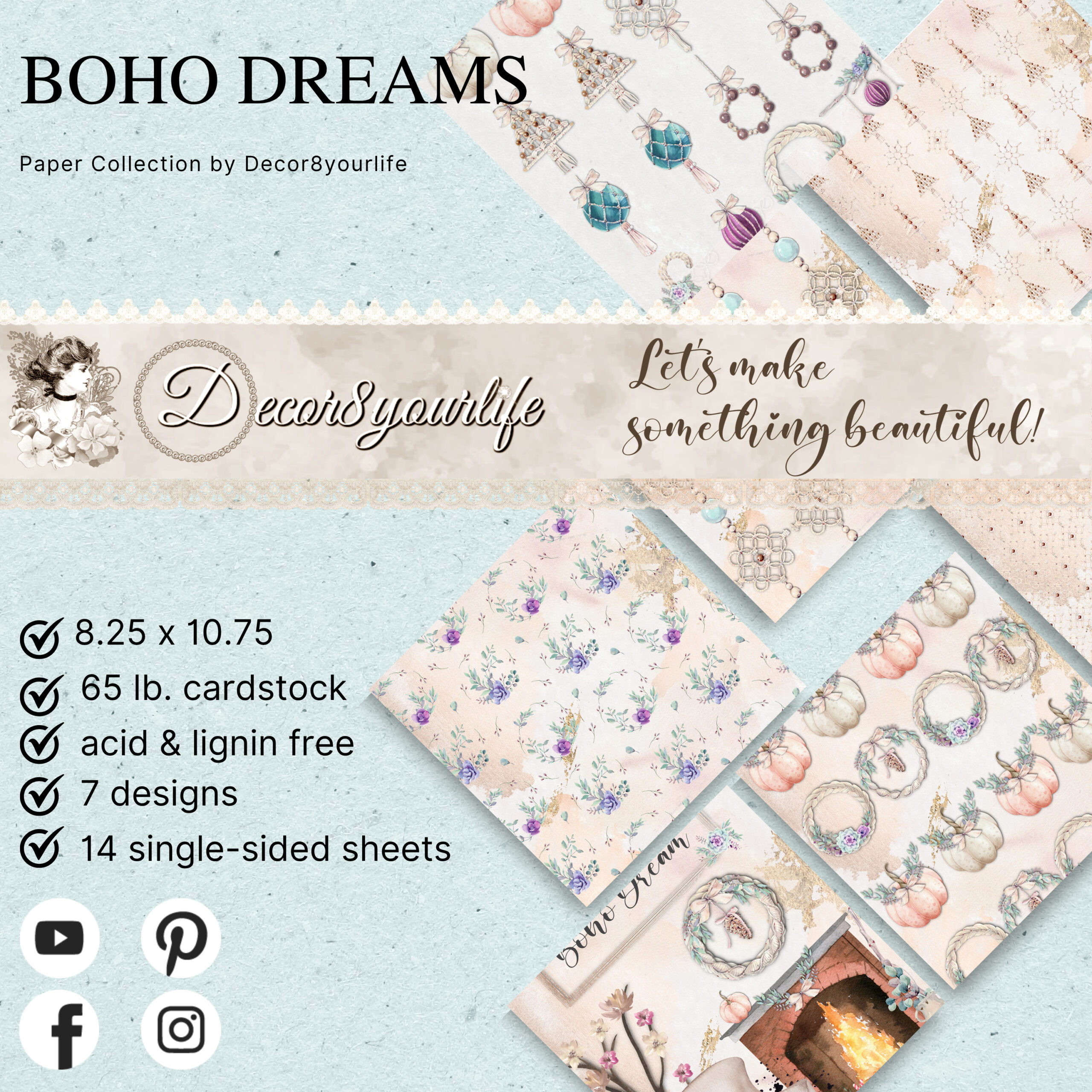 The 7×10 Scrapbook Paper Collection Boho Dream, consists of 7 designed papers.  This paper collection is printed on good quality 60 lb card stock.  You get two of each design.  This paper pack is perfect for your scrapbooks, mini albums, handmade greeting cards and a lot more!