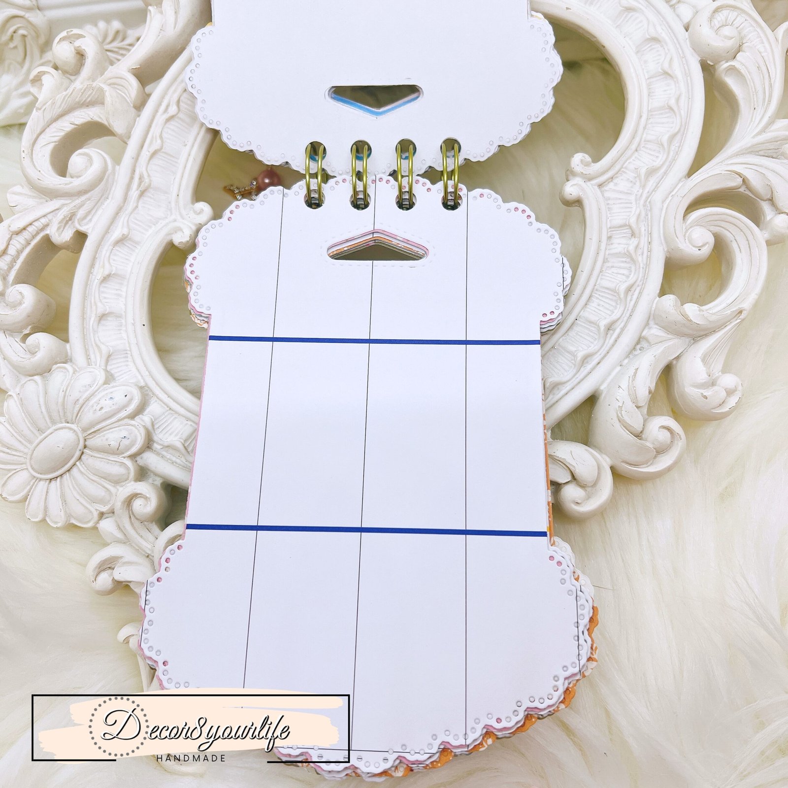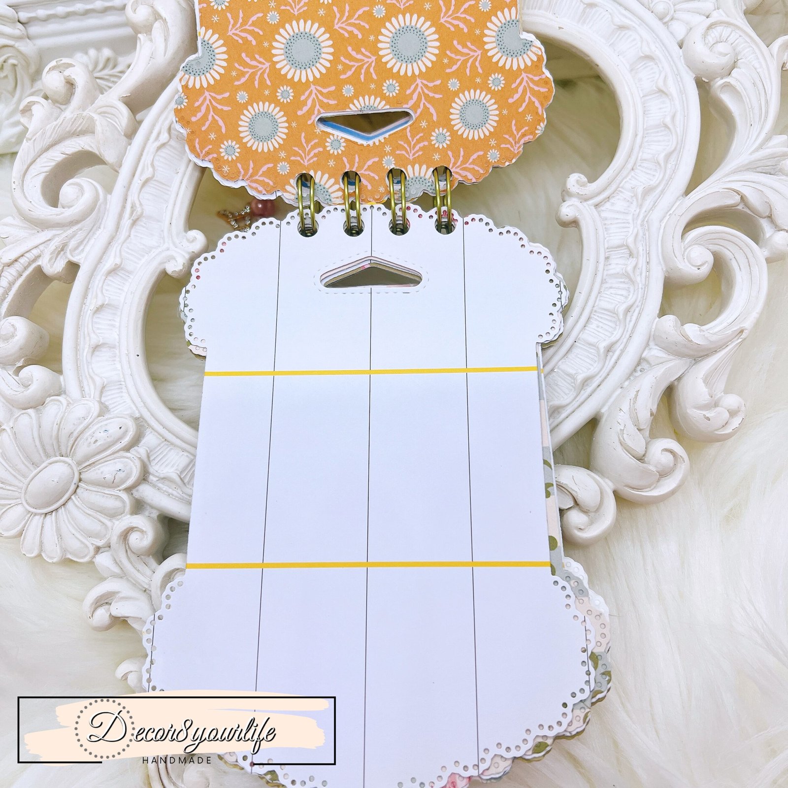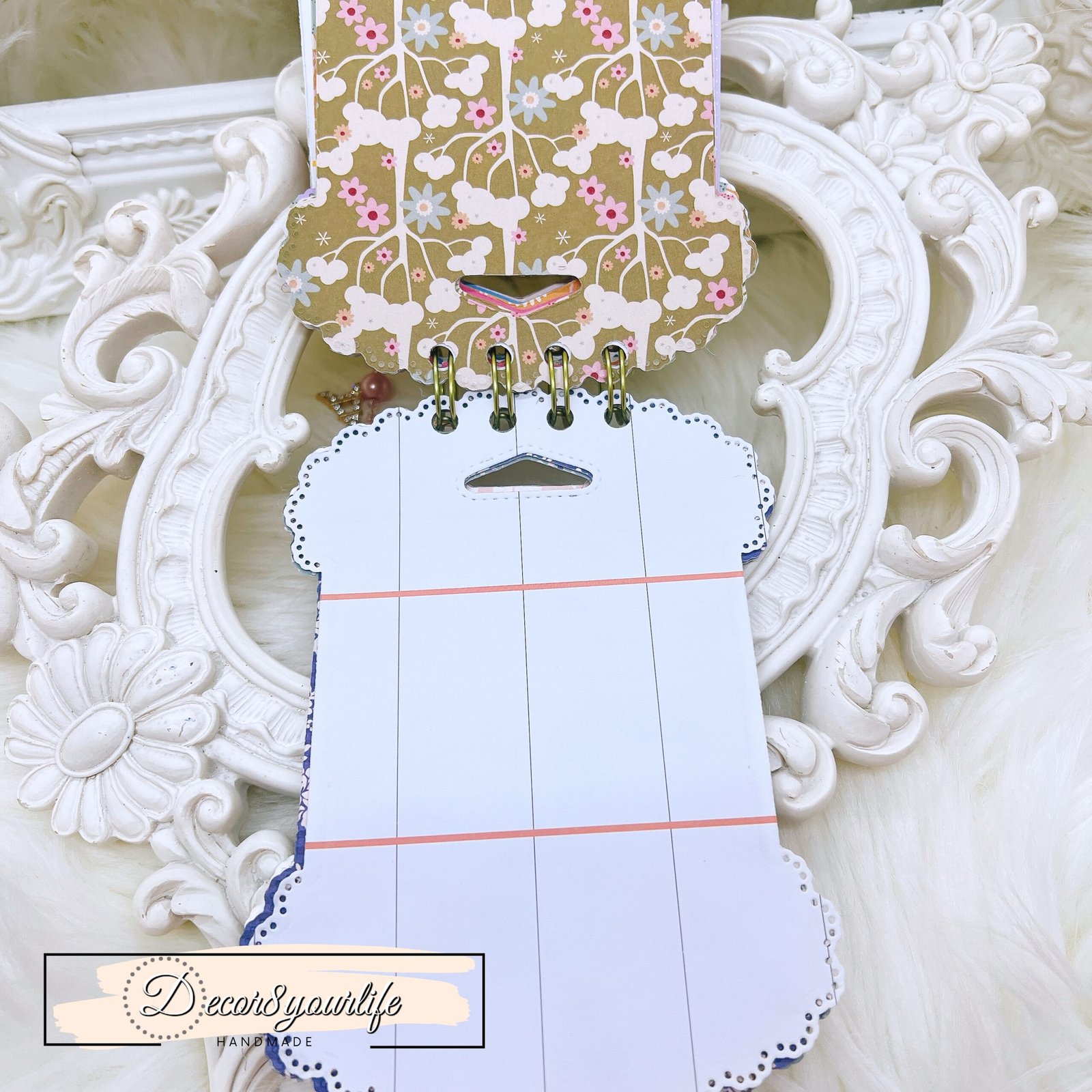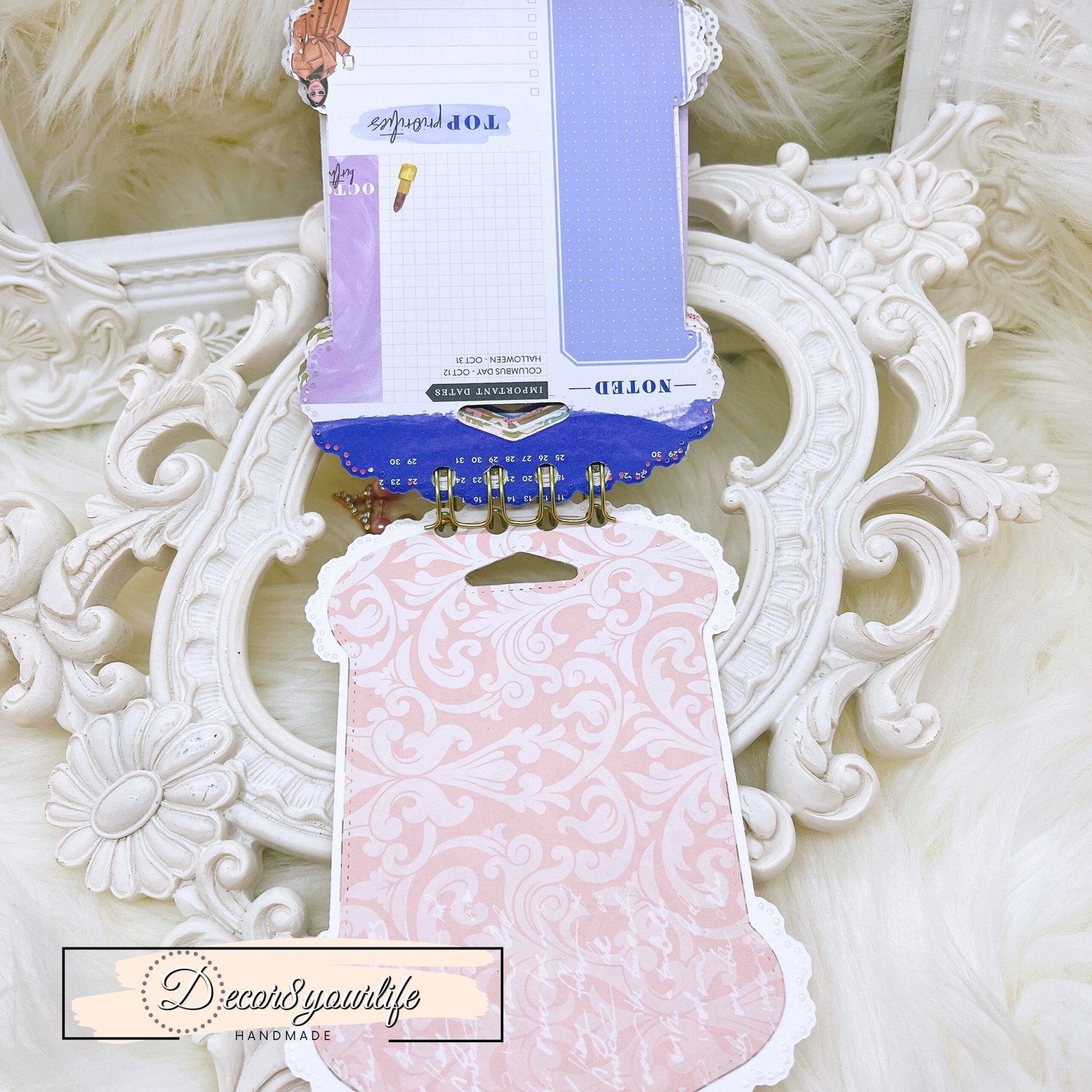 It combines our Pumpkins & Pearls papers, hand-cut die-shaped pages, and rescued planner sheets for a one-of-a-kind, eco-friendly keepsake. Every single sheet was manually die-cut to match the cover’s elegant shape, so the page edges echo the lace-tag outline. I also incorporate clean, blank sheets salvaged from expired planners—paper that would otherwise end up in a landfill. The result is a thoughtfully made, planet-friendly journal that looks boutique and feels practical for lists, doodles, gratitude notes, or scripture journaling.