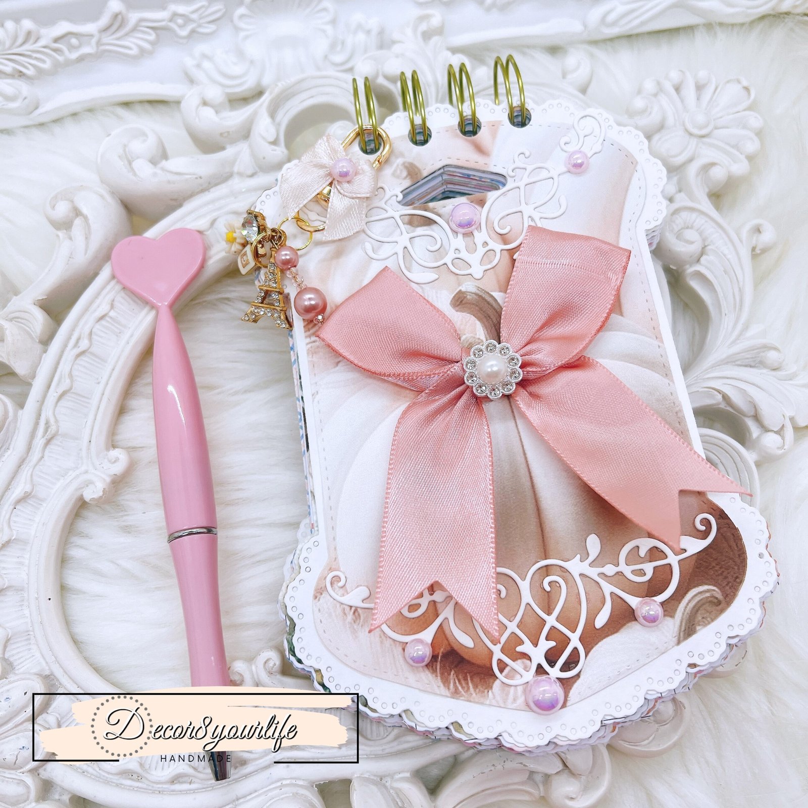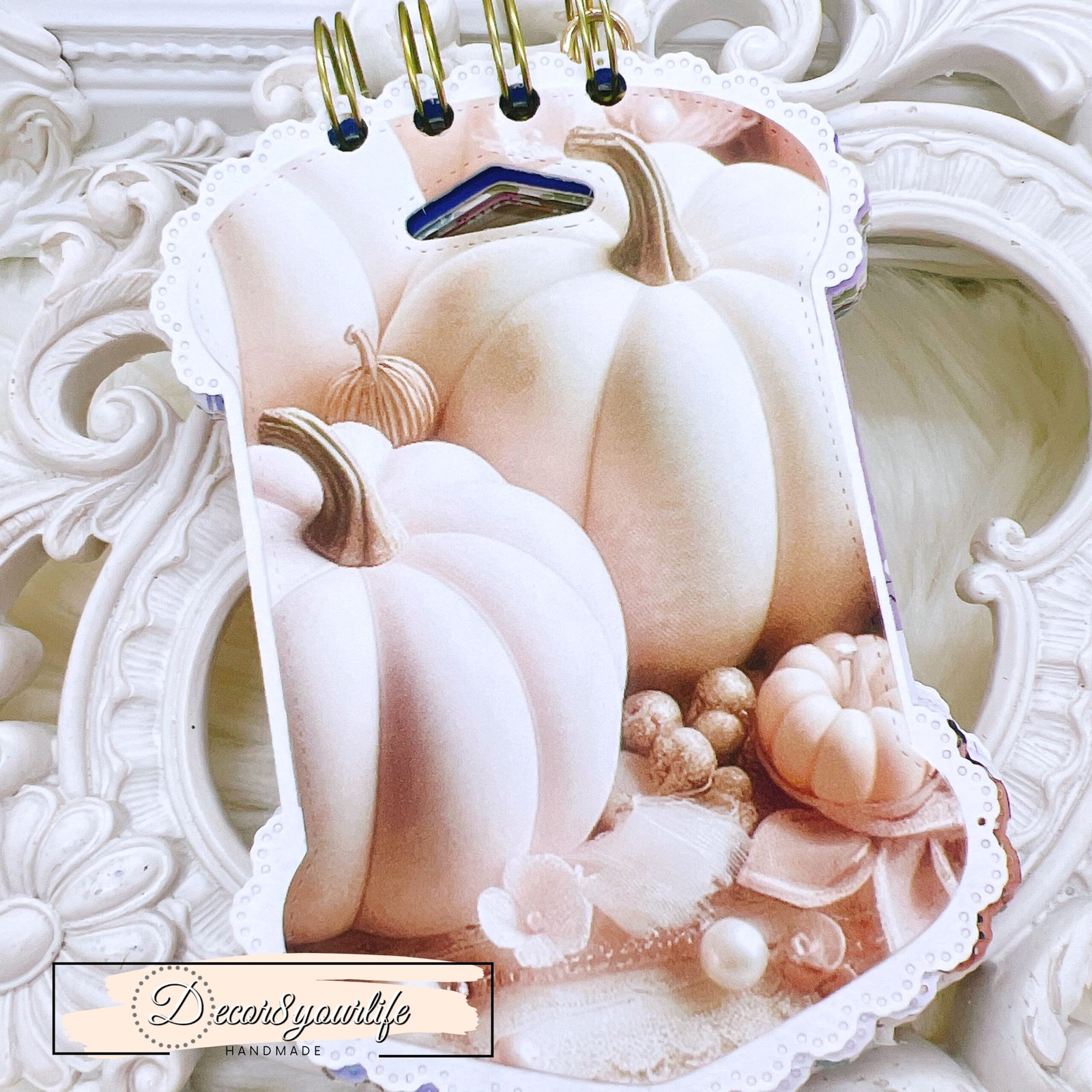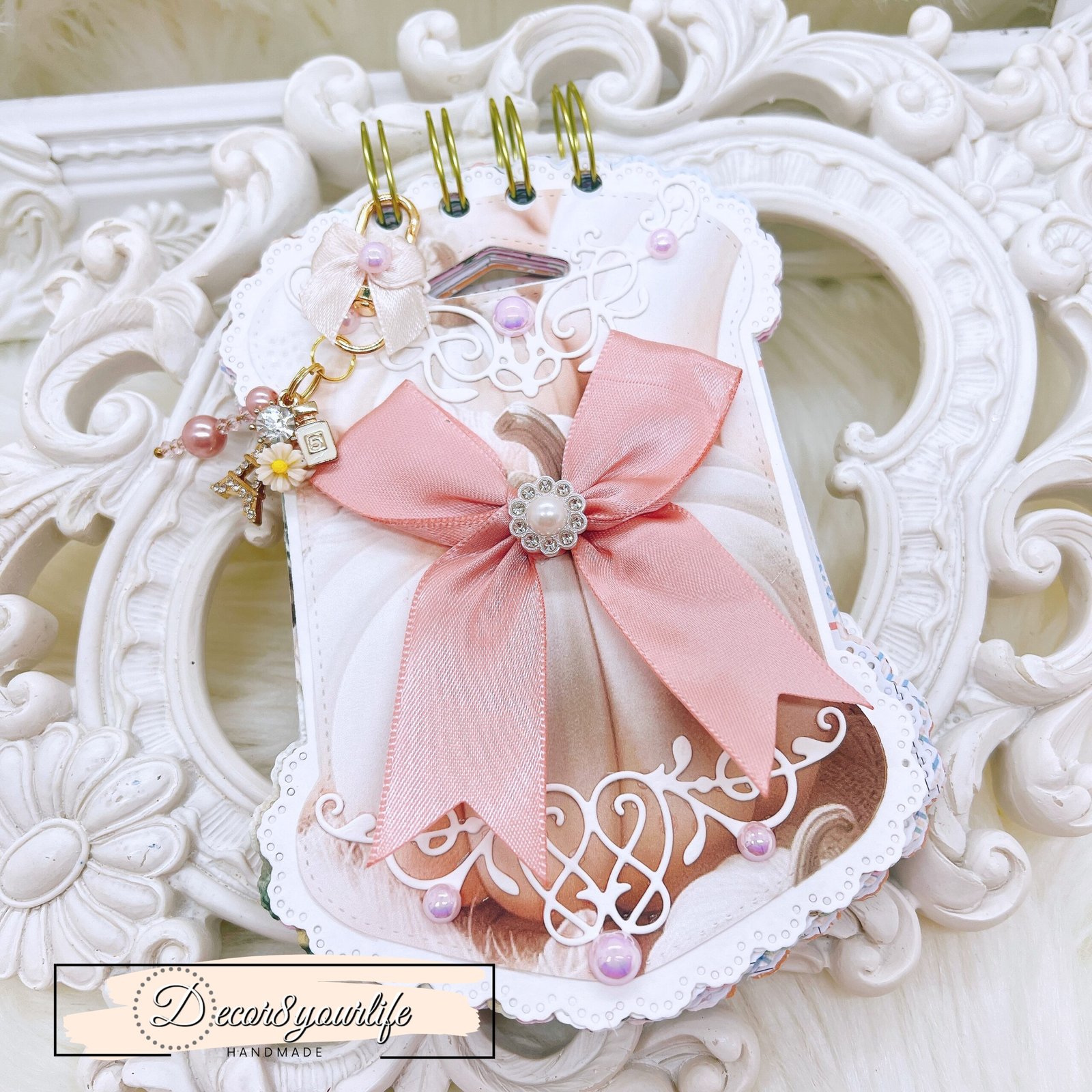 Meet a small but elegant journal that’s ready for everyday notes and pretty project ideas. The front and back covers feature papers from my Pumpkins & Pearls collection—soft whites, blush tones, and gentle pumpkin motifs—layered with delicate filigree die-cuts and pearl accents. The entire book is shaped with an ornate tag die, so the silhouette itself feels special in the hand. Inside, you’ll find 32 sheets (64 writing pages front/back) composed of assorted scrapbook papers from different makers; a few designs are retired, which adds to the charm and rarity of this piece.
