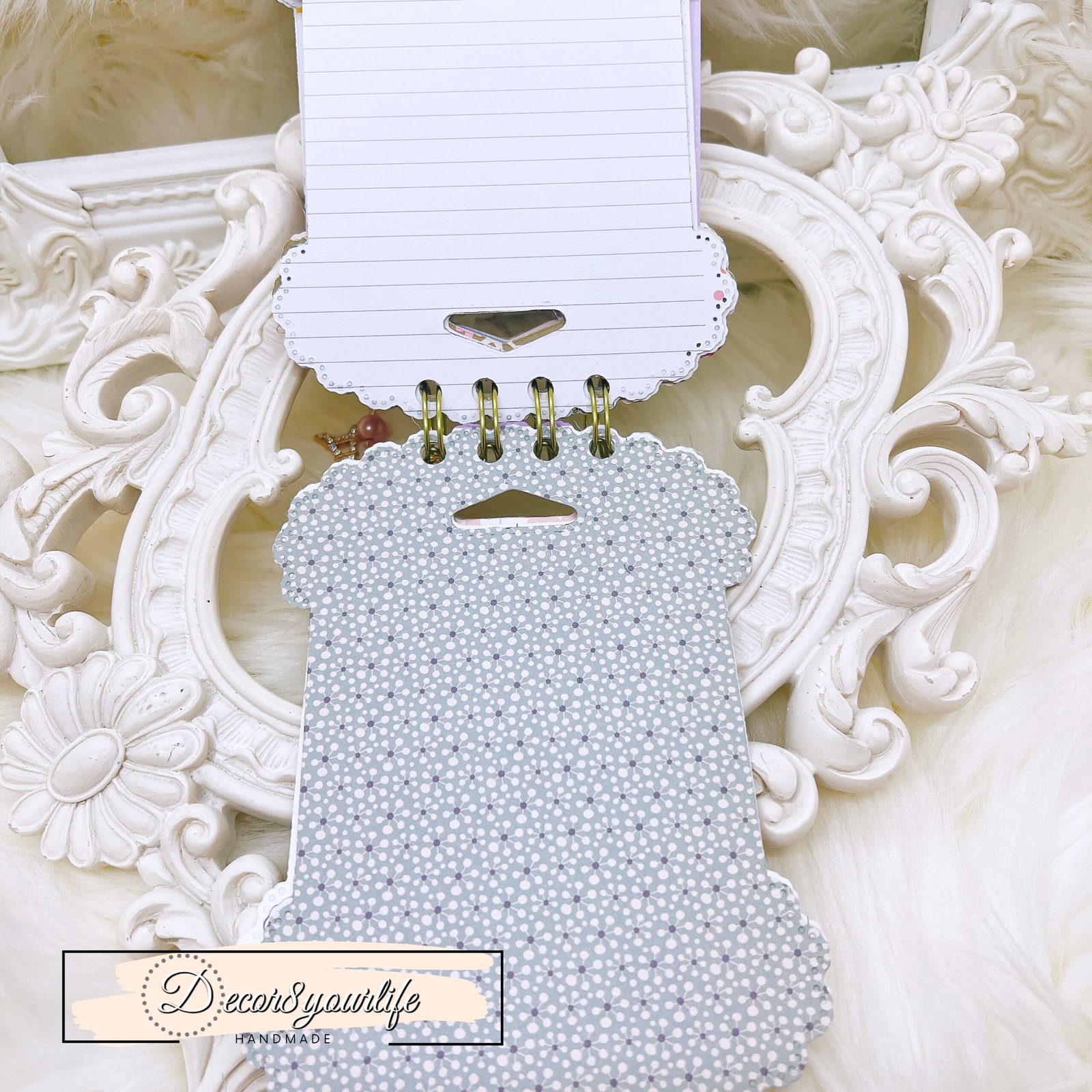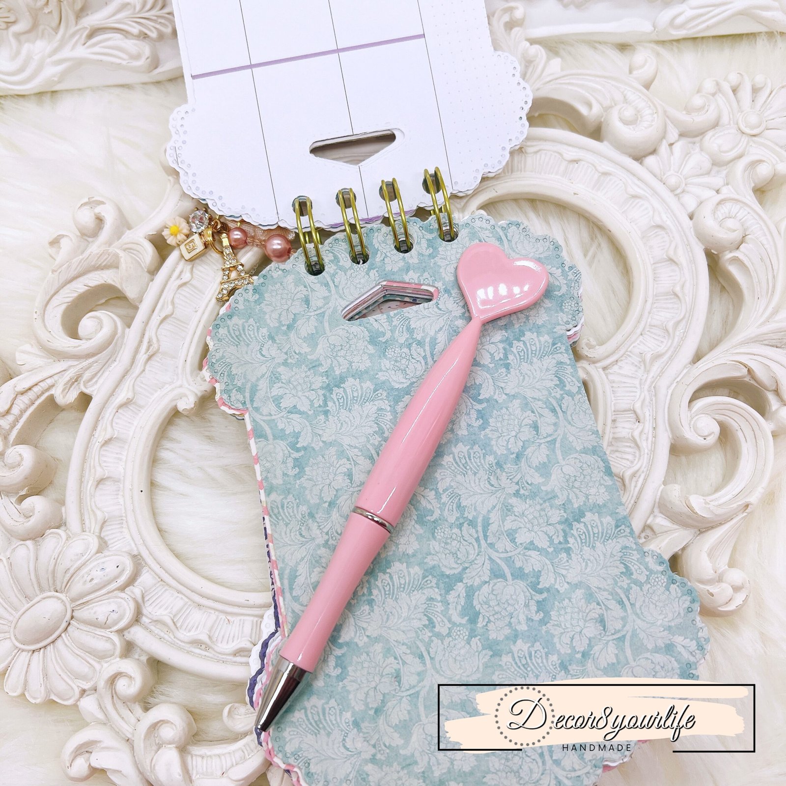 This pocket journal measures approximately 6.5″ x 6.5″ with about a 0.5″ spine—compact enough to slip in a purse but roomy enough for real writing. A glossy pink pen with a heart-top handle is included; it writes in smooth black ink for a tidy, everyday line. I’ve finished the coil with a removable purse charm cluster (gold-tone hardware, pearls, and a dainty accent) so you can dress up your bag or keep it on the journal as a tiny bit of sparkle. Whether you gift it to a friend or keep it for your own desk, it’s a sweet way to capture ideas, quotes, and plans in shabby-chic style.