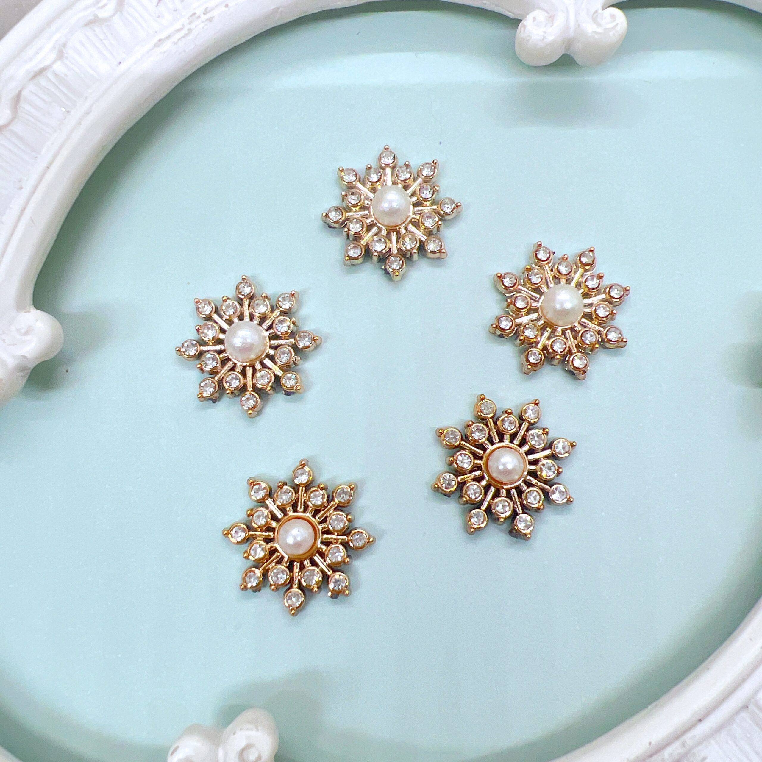 Add a touch of elegance and charm to your crafts with our beautiful Snowflake Rhinestone Cabochons with Peal Center embellishments, available in packs of 5. These pretty and feminine gold-tone flat-back buttons are perfect for a variety of DIY projects, from scrapbooks to card making and journal decorating.
