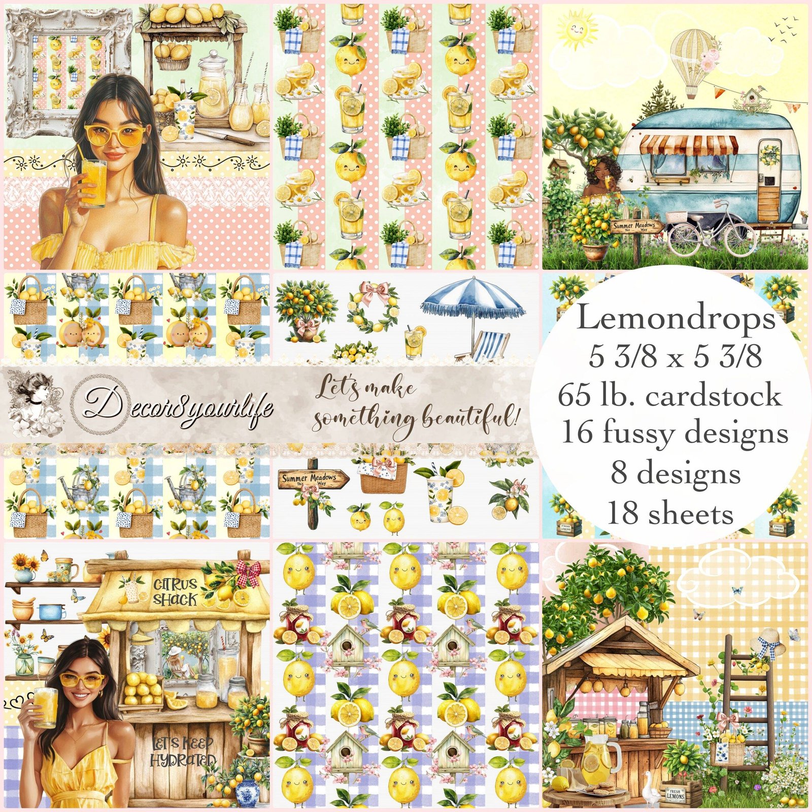 Let the sunshine in with this sweet and cheerful summer theme paper collection, Lemondrops by Decor8yourlife, now available in a convenient 5 3/8 x 5 3/8 size! Inspired by warm summer days, vintage campers, and baskets of fresh lemons, this smaller paper pack is perfect for mini journals, memorydex cards, flip books, handmade tags, and smaller-scale crafts.