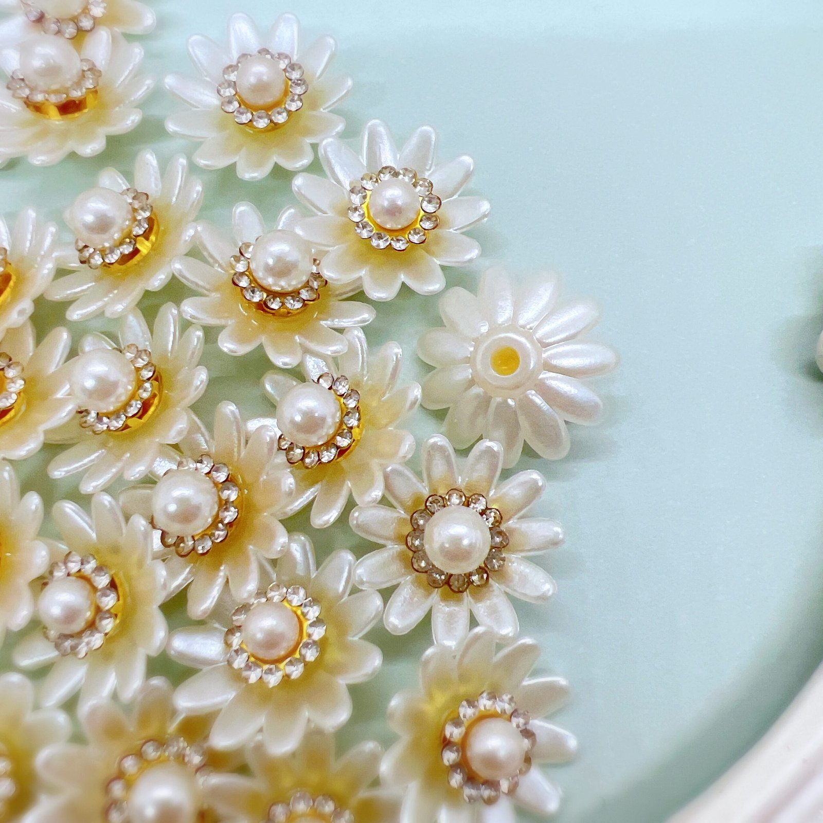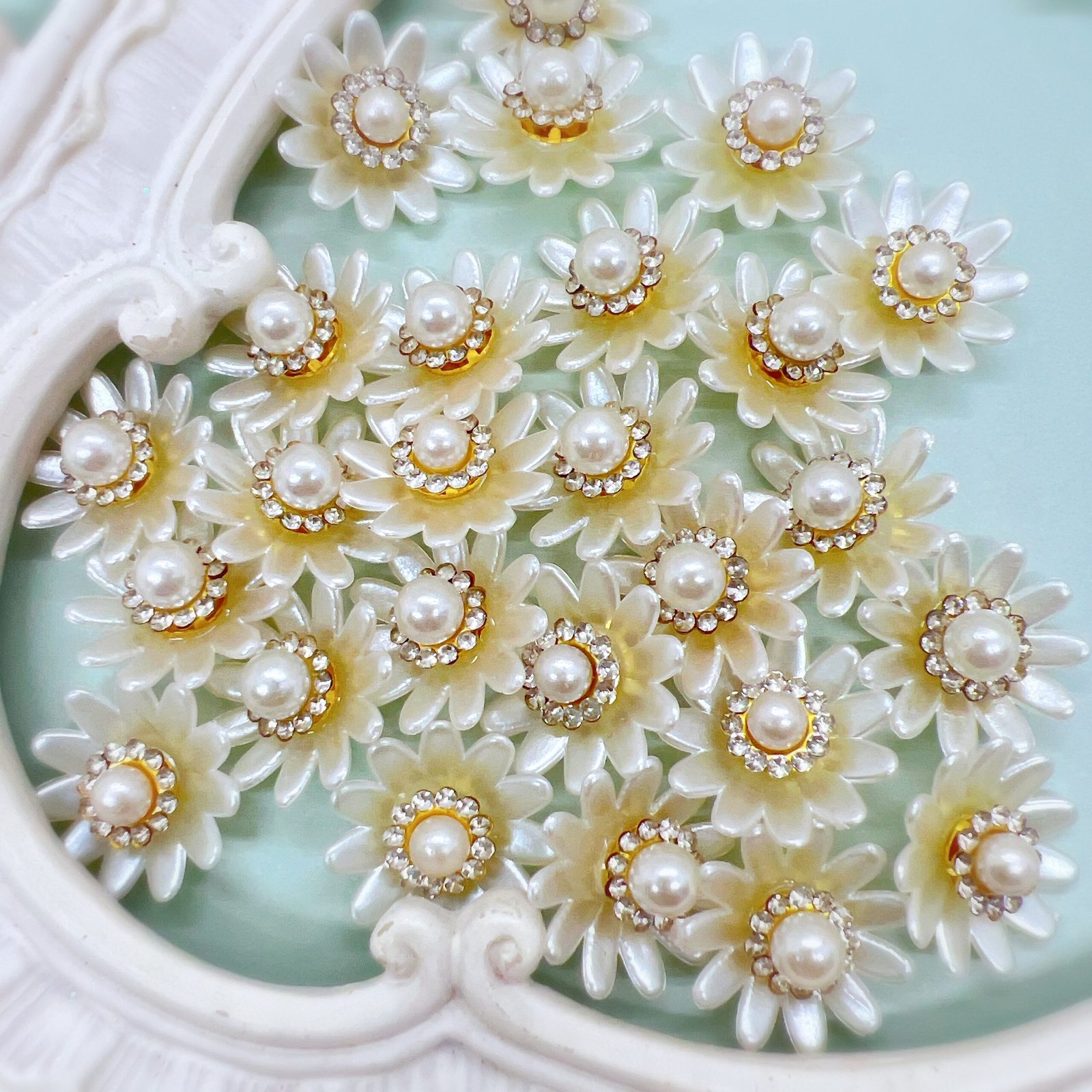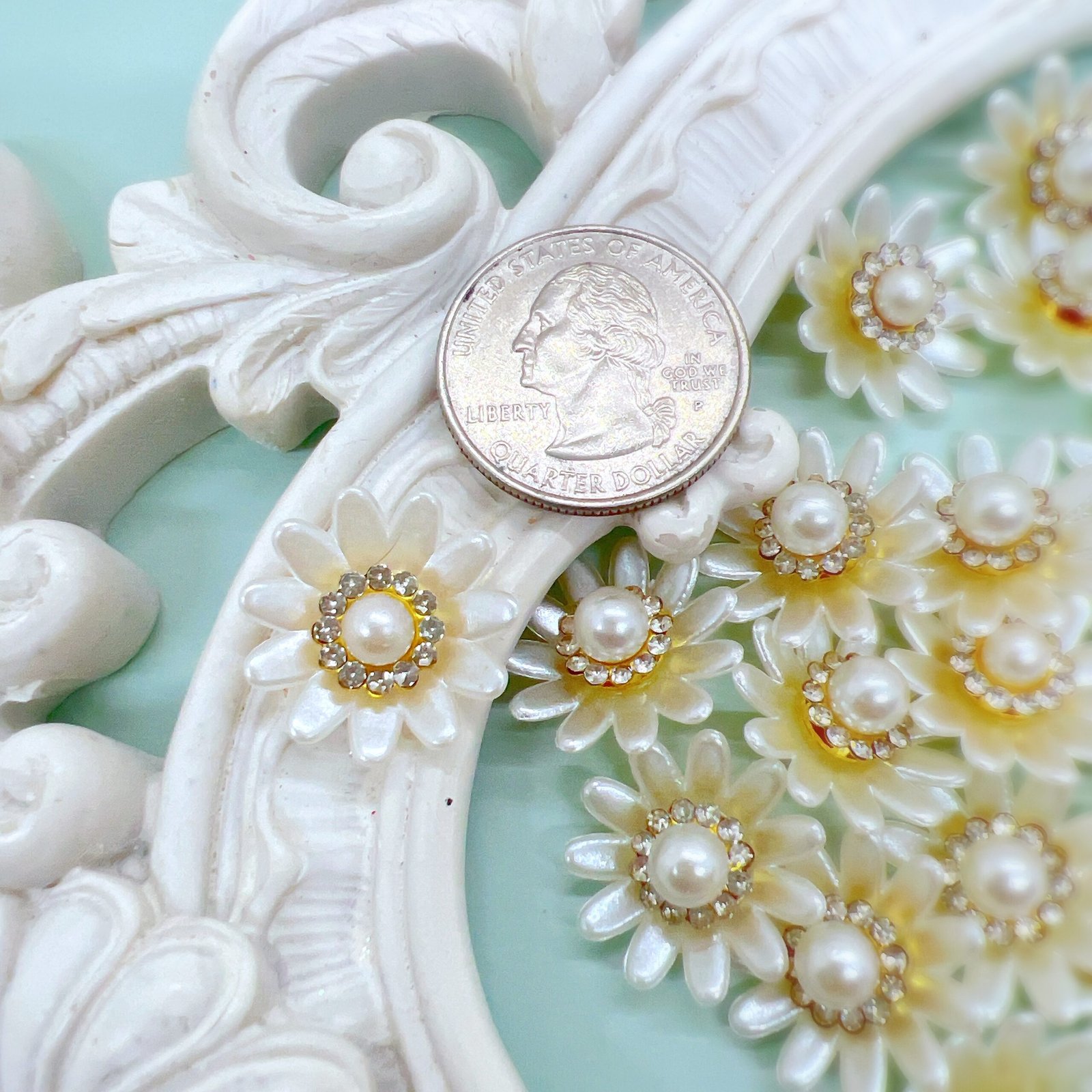 This pack of 5 white flower cabochons with rhinestone and pearl centers are designed to add a beautiful finishing touch to handmade projects. Whether you enjoy scrapbooking, journaling, card making, or altered art, this piece blends easily into a wide range of creative styles without overpowering your design.