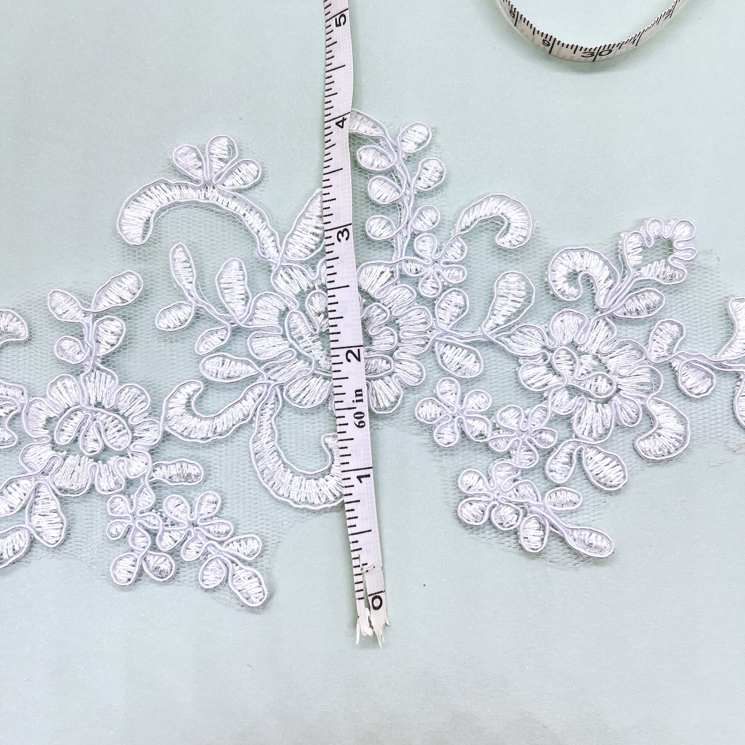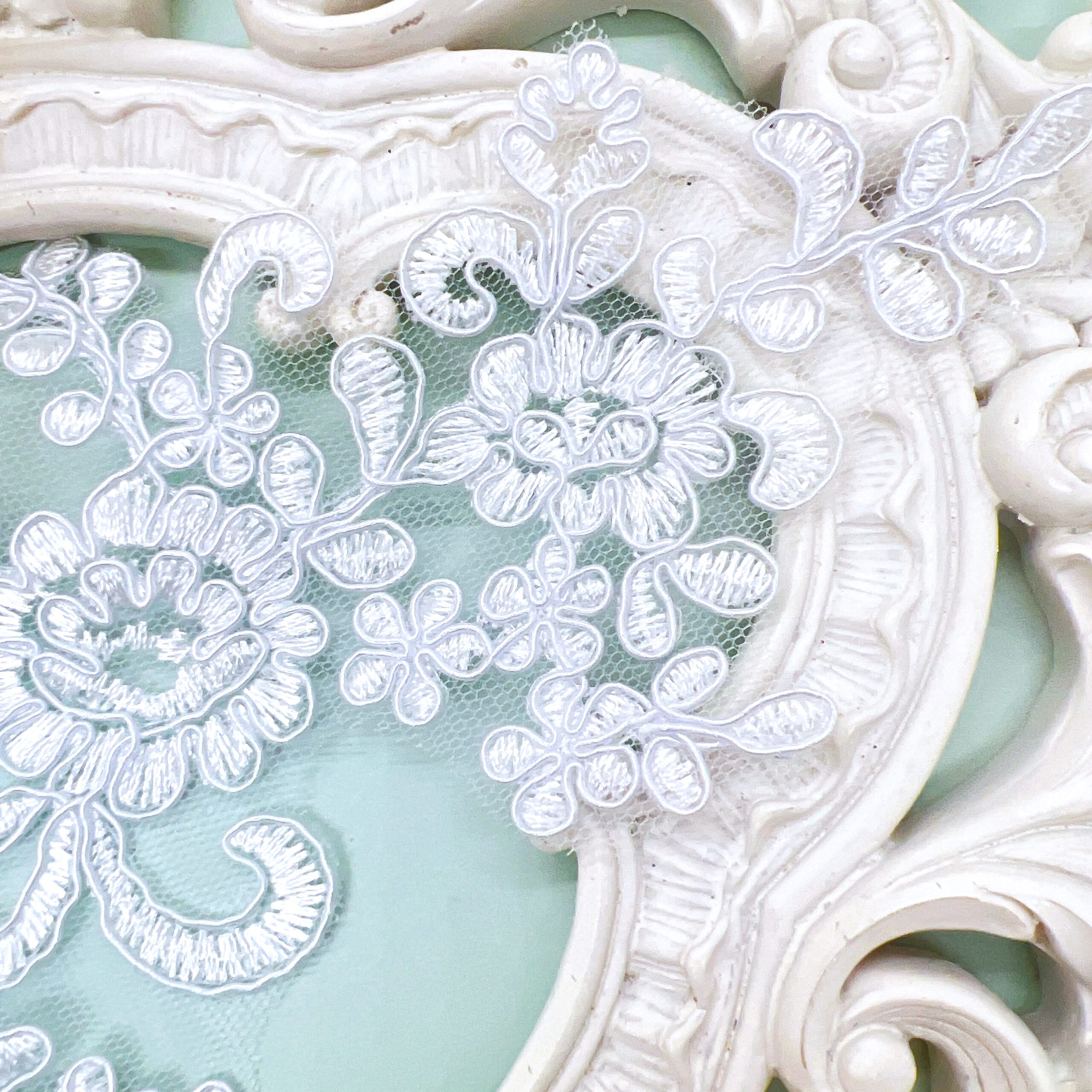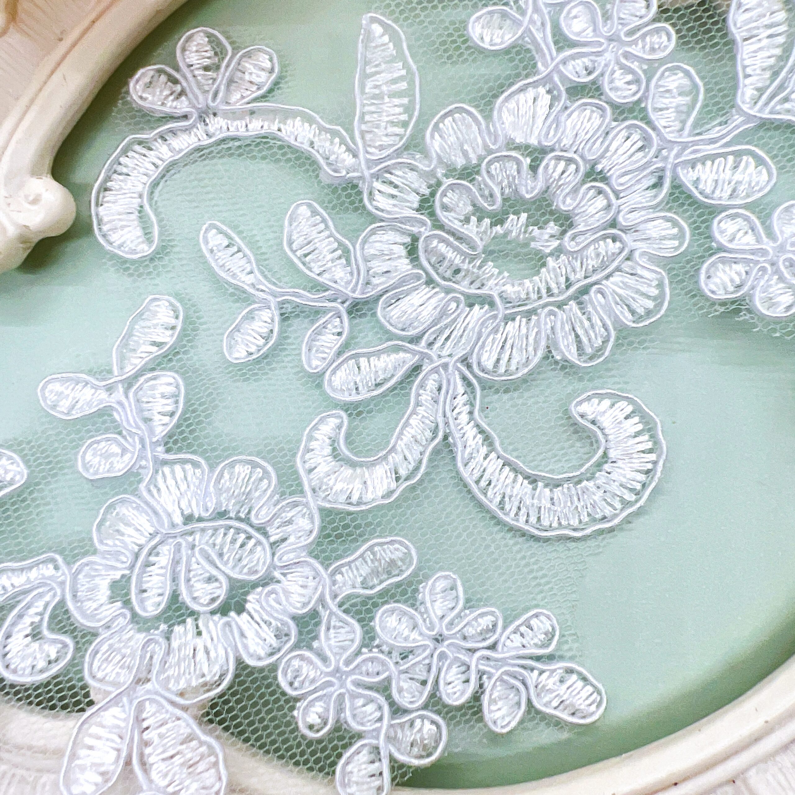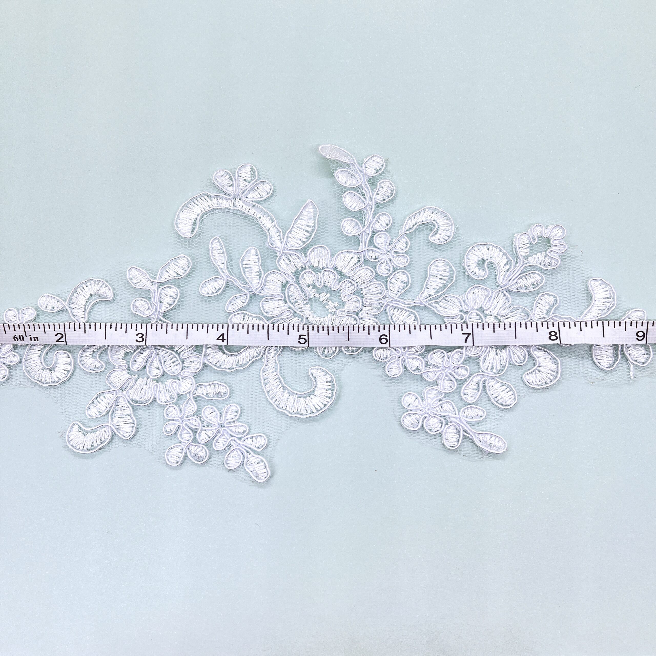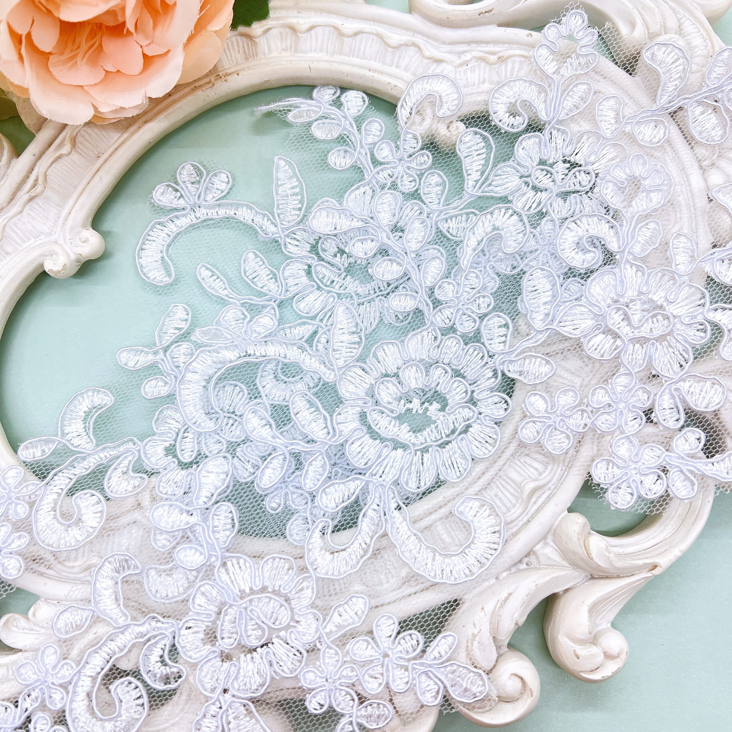 These white embroidered lace appliques are sold as a same side pair, making them perfect for balanced designs, symmetrical projects, and refined embellishing. Each applique features an elegant floral motif stitched onto soft mesh lace, giving them a light, airy look with beautiful texture and dimension.