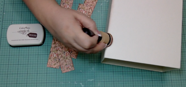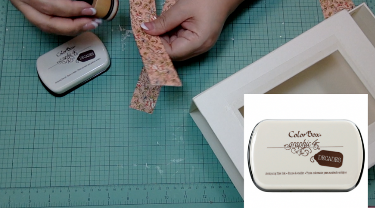 We begin with a Graphic 45 Deep Rectangle Matchbook Box in Ivory.  The box measures 8 1/2 by 6 1/2 and is 3 1/4 inches deep.  So it’s large enough to hold a set of cards or a mini album. We use an acetate sheet to cover up the window on the top of our box.  You may use double-sided tape to adhere this sheet. Graphic 45 Altered Box Cut 4 strips of paper from your graphic 45 Princess Collection. You’ll cut 2 large pieces and 2 small pieces. Graphic 45 tutorial Use the Clearsnap Decades Dye Ink Pad in Dark Cashmere to ink around the edges of both the strips and around the box. Now we’re ready to glue the strips to the top of our Graphic 45 box.  We’re going to miter the corners of our strips.  It’s an easy process that gives you excellent results! Graphic 45 Tutorial When applying glue to your strip (or box like in the picture above), stay clear from the ends. You’ll want to leave about an inch and a half of space at the ends. Graphic 45 Princess We then lift the ends together and cut through the strips at a diagonal.  Once you have done this to all four corners, you glue the ends down to your altered box. Paper Crafting Tutorial We are now ready to trim our side pieces. Trim 2 pieces at 8 3/8 x 3 1/8 inches and 2 pieces at 6 1/8 x 2 7/8 inches.  I decided to go with coordinating pieces for this part. Graphic 45 tutorial Don’t forget to ink around the edges of these strips as well. how to alter a graphic 45 box Next you adhere these side strips to the box. You may use crafting glue or double-sided tape for this part. how to make an elegant box Once all four side strips are glued down, you are ready to decorate your Graphic 45 Matchbook Box! Have fun with this part. Use your trims, your bling, your Graphic 45 Rose Bouquet flowers, your Graphic 45 Keys, etc. Graphic 45 tutorial Graphic 45 rose bouquet Graphic 45 Keys