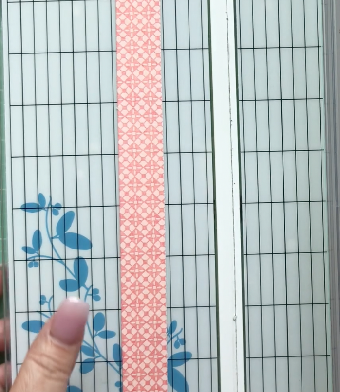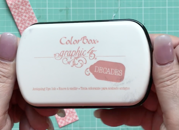 I trim a piece from the Thoughtfully Planted sheet to 7/8 x 8″; then I ink around the edges with Colorbox Graphic 45 Ink in Precious Pink.