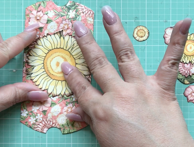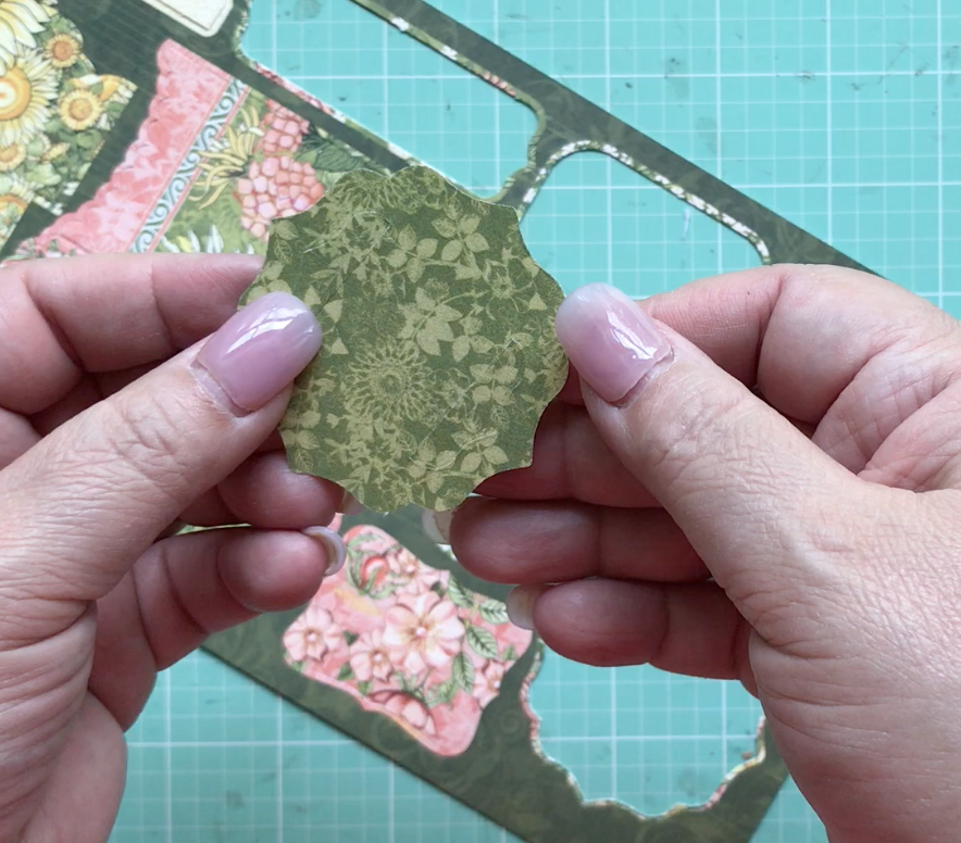 Here you see me showing you the Graphic 45 leaf dies that I’ll be using to add to my fussy-cut flowers.