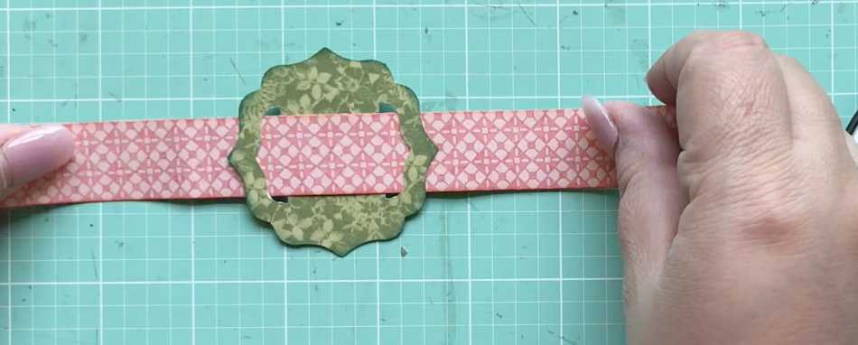 I use the buckle from the Graphic 45 Garden Goddess Tags & Pockets.  I also ink around the edges with Colorbox Graphic 45 Velvet Teal ink.  Once that’s done, I’m ready to thread the pink strip through the buckle.