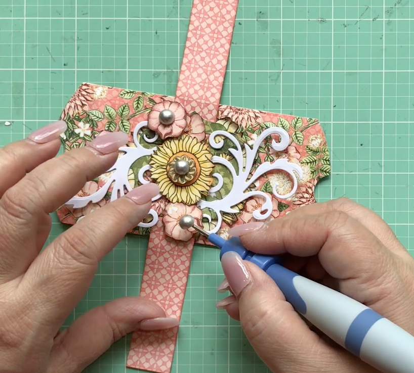 And once I glue the band to the center of the pillow box, I add some flourishes from my stash.  I also apply some Graphic 45 Matte Pearl Gems.